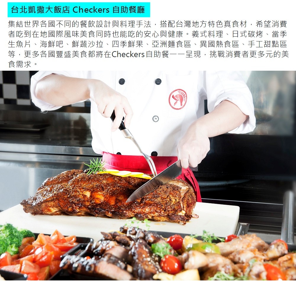 *台北凱撒 Checkers平日自助午或晚餐或週日晚餐1客。(週六全天及週日午餐需加價100元)