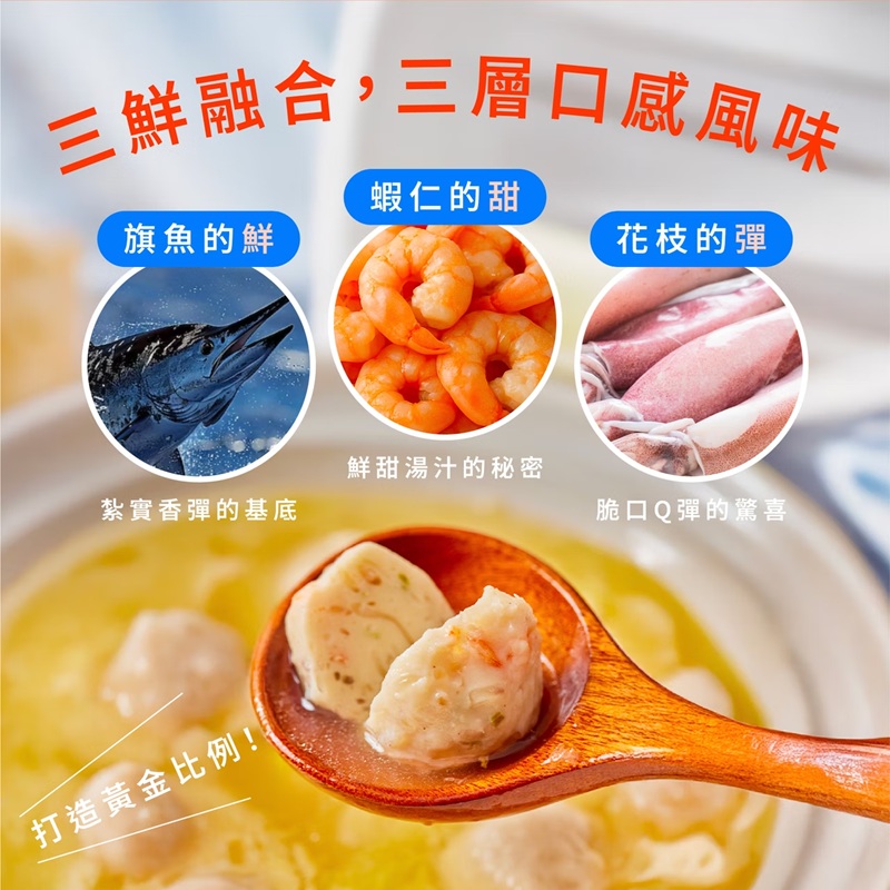 ● 嚴選旗魚漿打底,搭配鮮甜蝦仁與脆口花枝