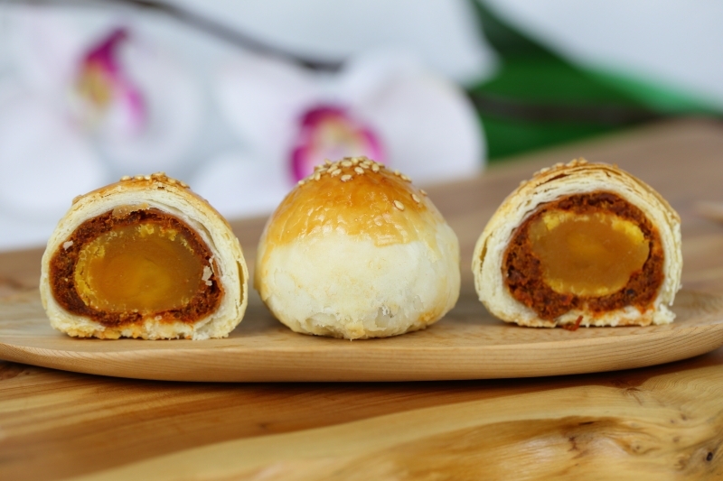 牛肉蛋黃酥:嚴選頂級鹹蛋黃及上選牛肉鬆,黃金口感絕佳搭配,吃1口2種享受,香氣飽滿沒有腥味。