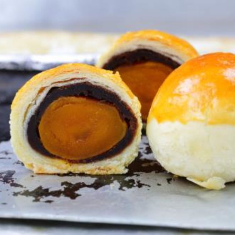 蛋黃酥:普一吳師傅手工現作,獨創三平一折擀皮工法,造就36層以上極致酥脆,嚴選頂級鹹蛋黃,再以高梁酒提味,香氣飽滿沒有腥味。