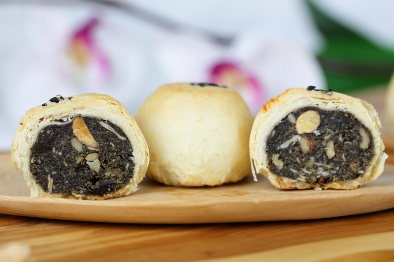 黑麻酥:普一翻毛椒鹽迷你版。採用黑芝麻作基底,融和多種堅果類新鮮食材入餡,富含高鈣養生價值,復以花椒提味,鹹鹹甜甜,香醇濃郁,爽口不膩。