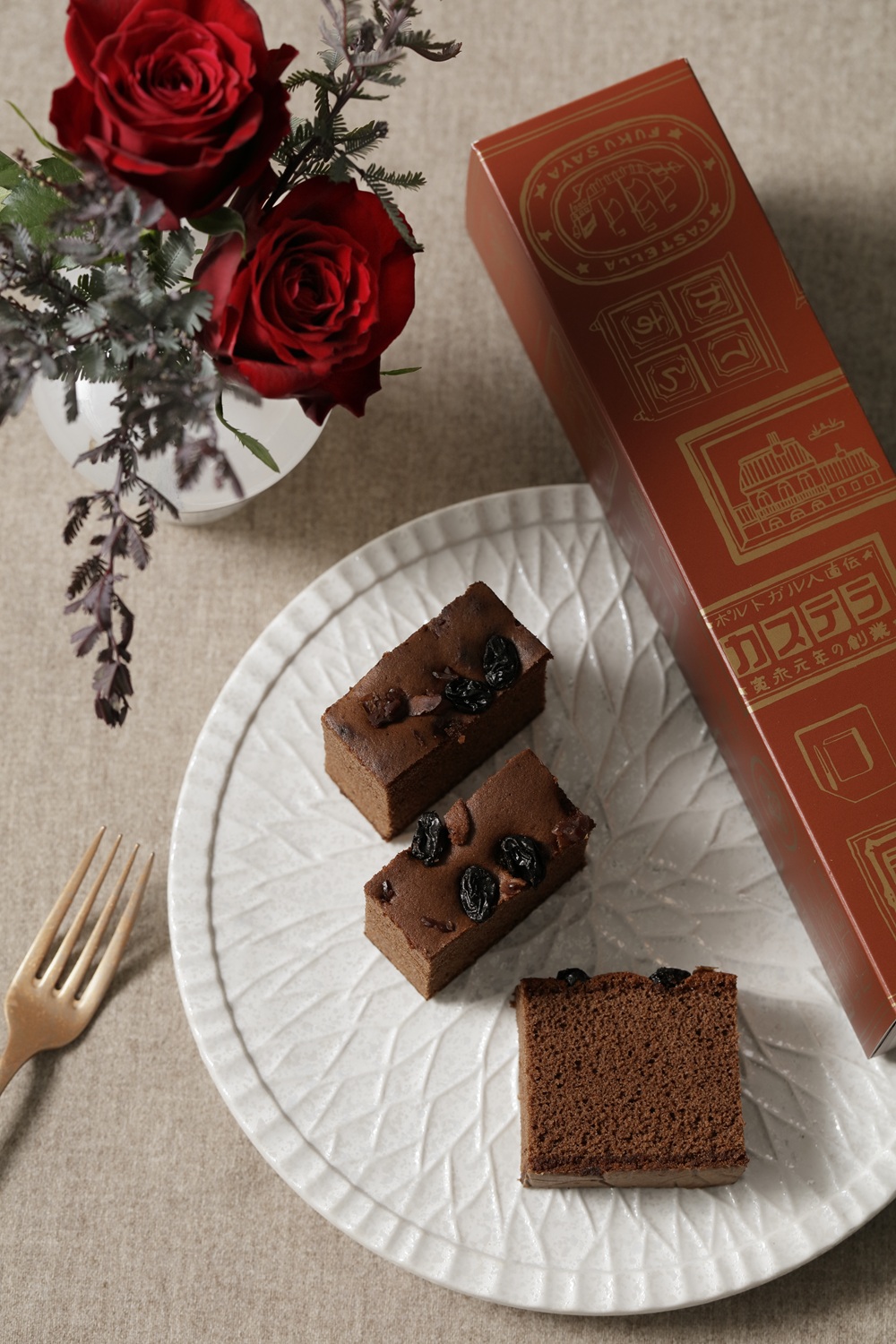 在採用精選雞蛋、砂糖、糖漿和小麥粉的的傳統長崎蛋糕中,加入優質功克力,並在上面鋪上胡桃和葡萄乾後,直接在火上烤烘,是香氣洋溢、口感柔和的蛋糕點心。