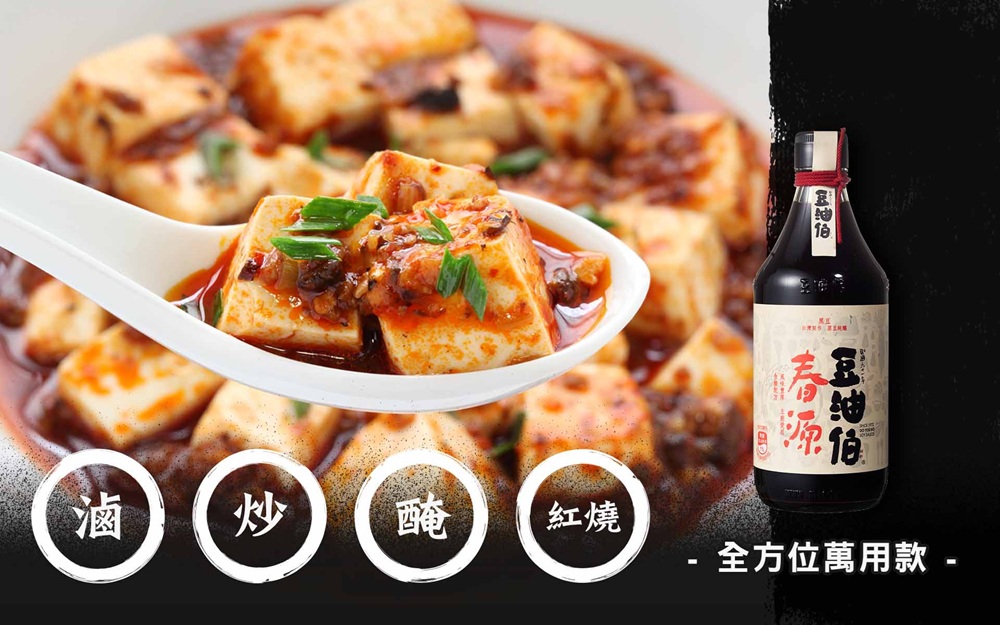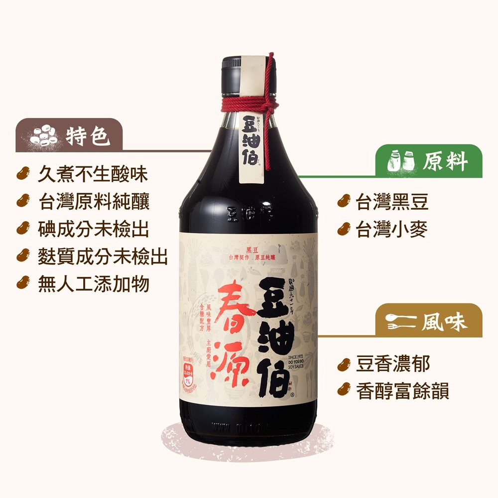 『春源』家傳商號,豆油伯以此為名,全新推出春源醬油,全瓶選用精選台灣黑豆純釀製成,用好的台灣原料,釀出好的台灣醬油,長時間料理醬油推薦:適合滷煮、紅燒料理,支持台灣農民契作黑豆釀造,風味醇厚有層次。