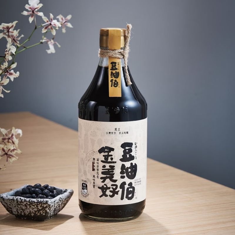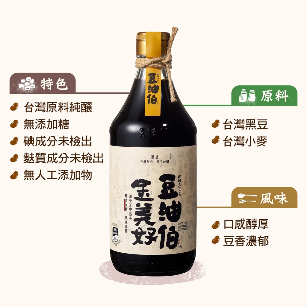 『豆油伯無添加糖金美好醬油』 適合長時間料理,嚴選臺灣的黑豆無添加糖釀製而成,黑豆無噴灑落葉劑,原豆純釀造工法,粹釀出無添加糖醬油,每一滴高濃度不稀釋,從產地到開始釀造過程中,讓滴滴都是精華。