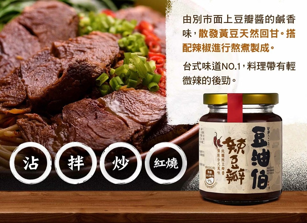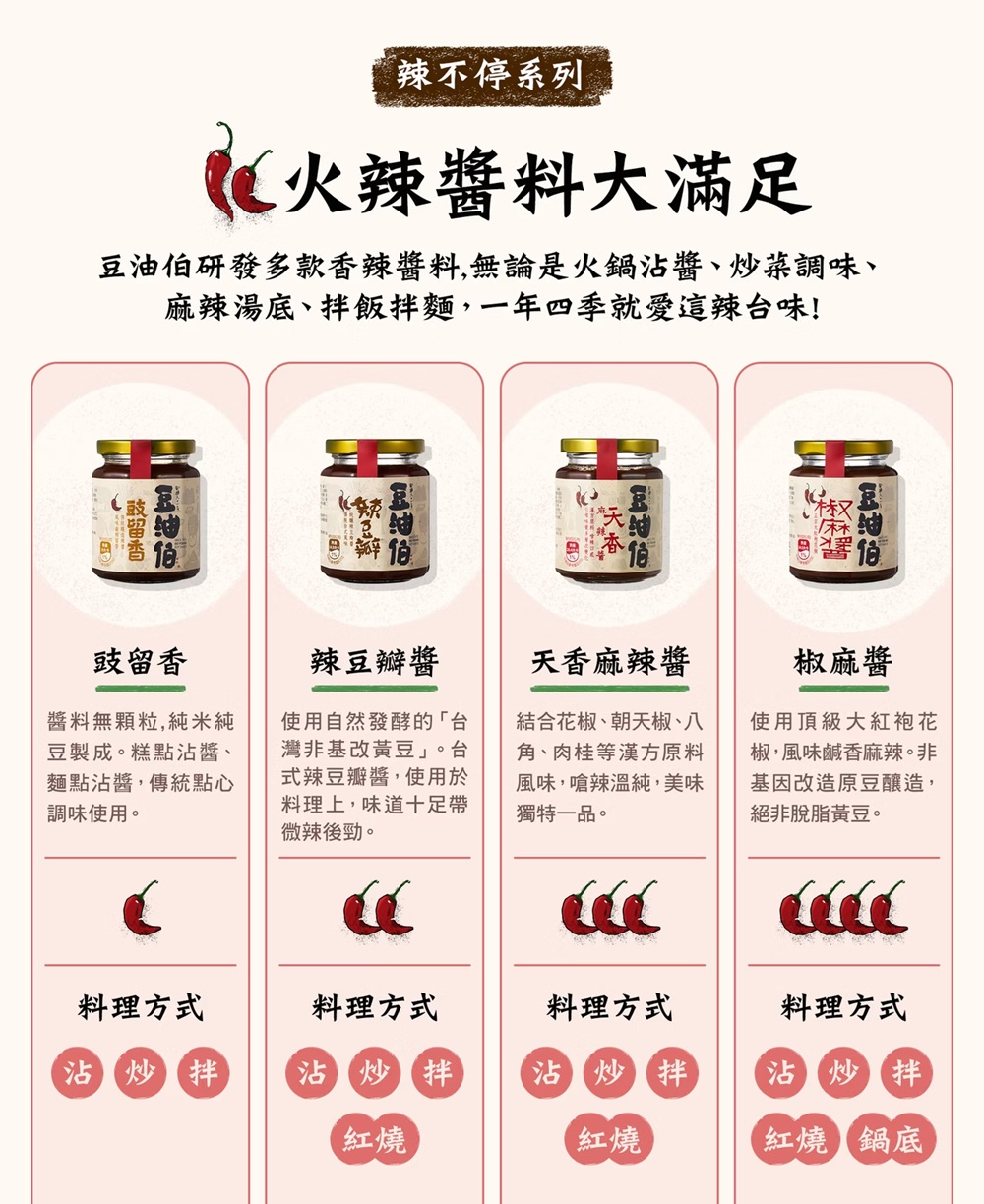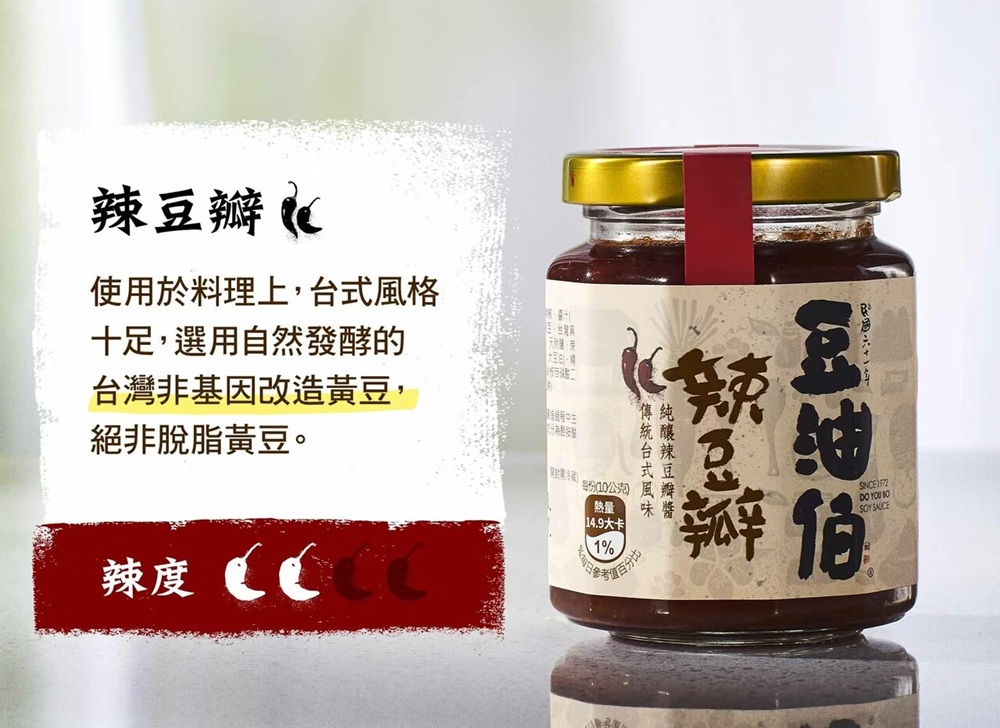 使用自然發酵的台灣非基因改造黃豆磨成泥,搭配辣椒進行熬煮,有別於市面上的辣豆瓣醬只有鹹香風味,豆油伯辣豆瓣醬有黃豆自然發酵後的天然回甘,每一口都辛辣有感,讓美味料理留在舌尖無限延伸。辣豆瓣醬也可以使用於料理烹煮上,不僅味道十足,一盤清淡菜餚,多了一道輕微辣的後勁。