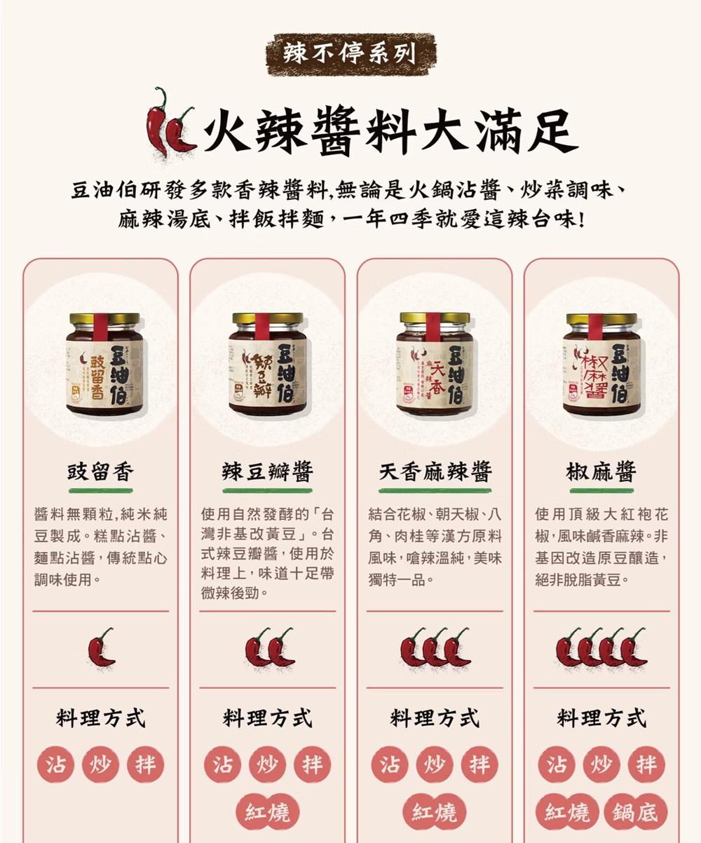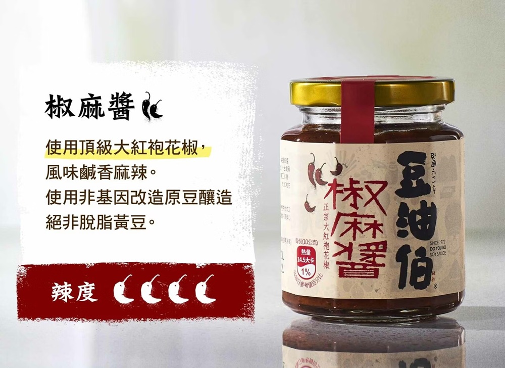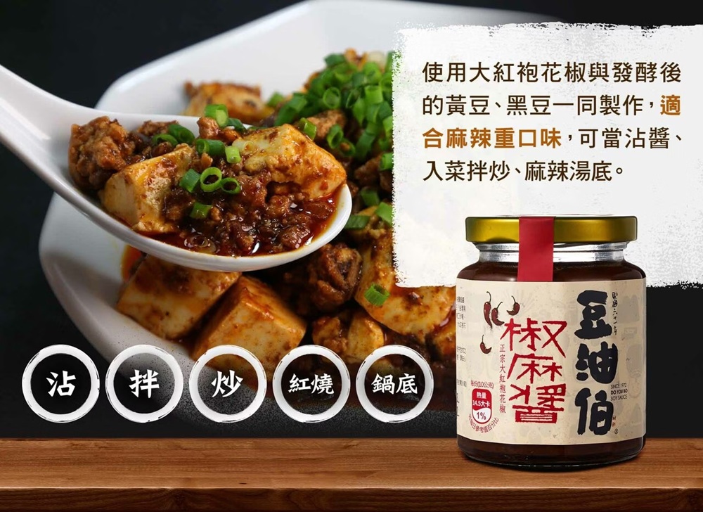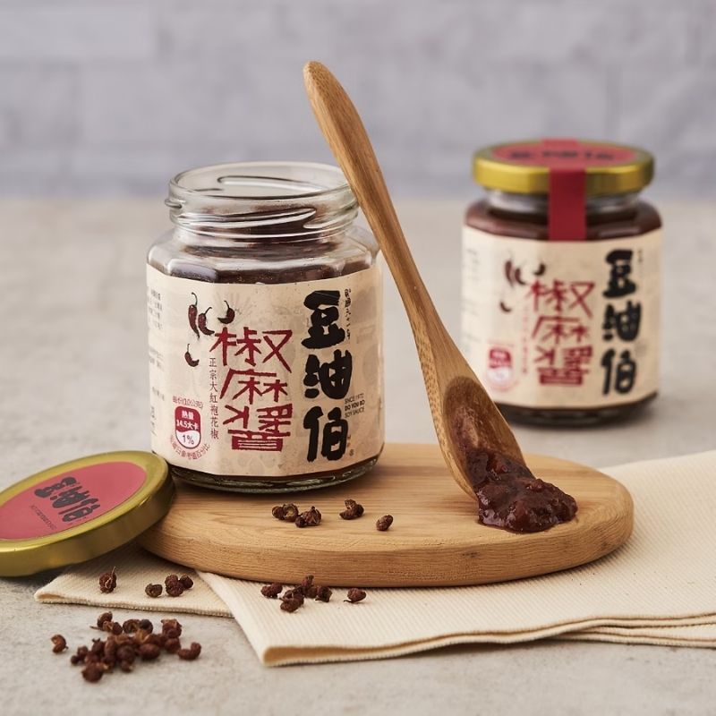 豆油伯椒麻醬使用大紅袍花椒與發酵後的黃豆、黑豆一同製作,椒麻醬風味鹹香麻辣,適合麻辣口味較重的顧客品嘗。