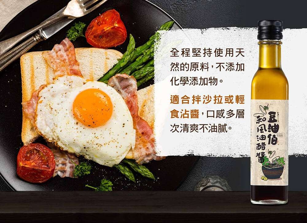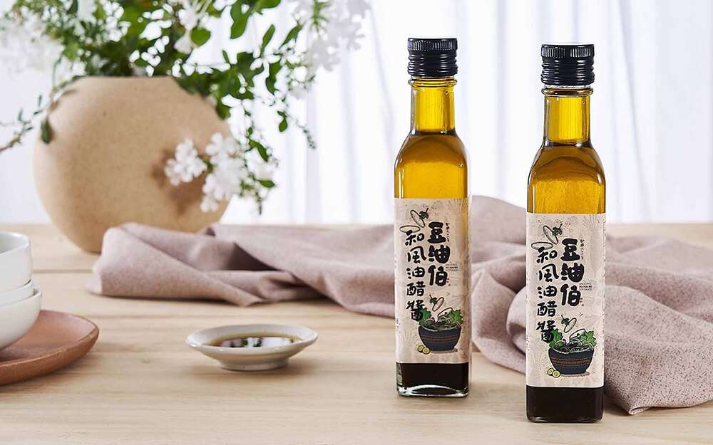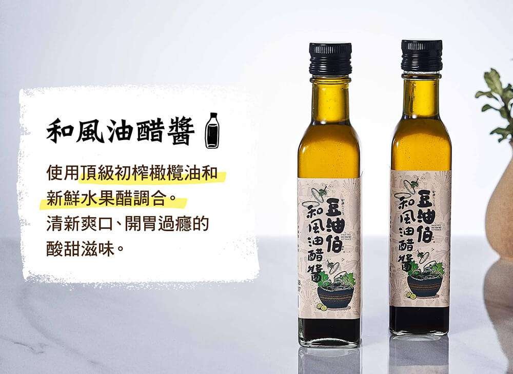 『豆油伯和風油醋醬』使用西班牙原裝進口頂級初榨橄欖油、新鮮水果醋、和穀物醋調合而成,有天然蔬果香味,口感更多層次;由豆麥穀物釀造的食用醋,豐富營養成分,加上初榨橄欖油的清爽不油膩,是六堆釀豆油伯強力推薦的新食代好味道。