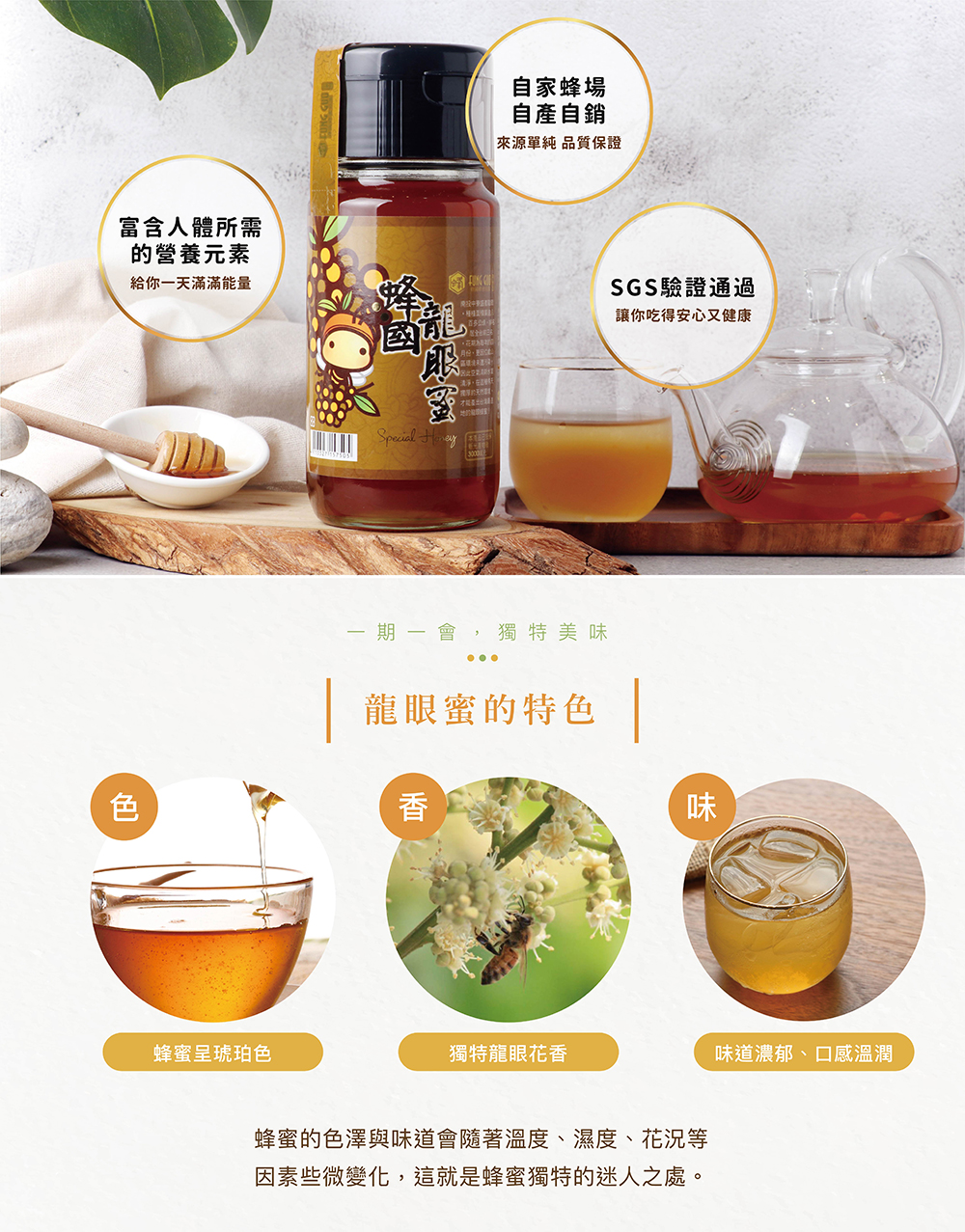 香氣濃郁,甜味⼗⾜,是台灣⼈最愛的單花蜜,有著濃烈的龍眼香氣,且⼝感及甜味濃郁,不易結晶是其⼀⼤優點。