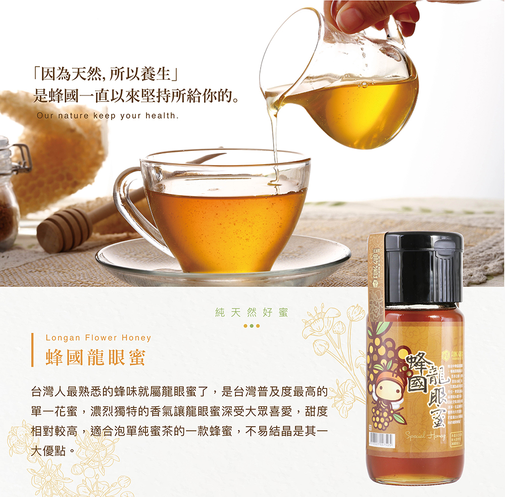 連續多年獲獎見證,是蜂國蜂蜜莊園的驕傲。採自中寮龍眼花完全盛開時,花期只有5~7天,嚴格限定氣溫需達28~30度才能採集,採集難度高、年產量只有800~1200瓶,純度高、香氣濃,含龍眼花酵素,是天然的液狀維他命。