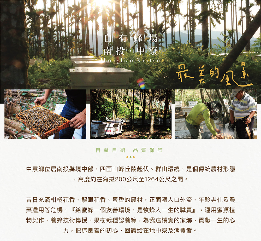 南投中寮盛產龍眼,種植面積廣達八百多公頃,排名居全台前三名,花期為每年的四月份,因位處山區環境未遭污染,空氣清新水質清淨,得天獨厚的環境,產出台灣最道地的龍眼蜂蜜。