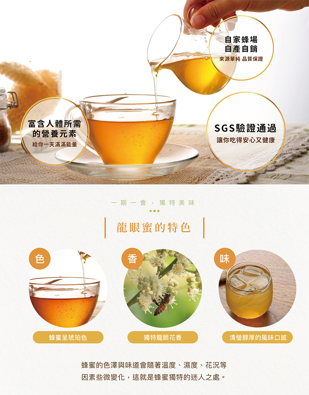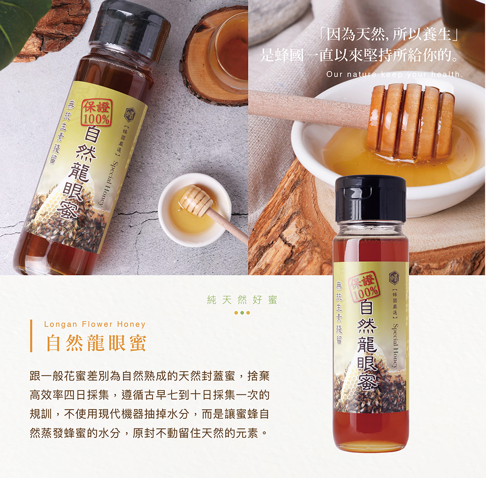 自然龍眼蜜謹守古早養蜂人平均7日至10日採集一次的規訓。捨棄一般的四日採集,得足足犧牲50%的採收量,能夠讓蜂蜜透過蜜蜂自然醞釀熟成後,直接採集封存,不需要用機器濃縮水份。如此一來,便能完全保留蜂蜜天然的營養元素及醇厚的風味與香氣。