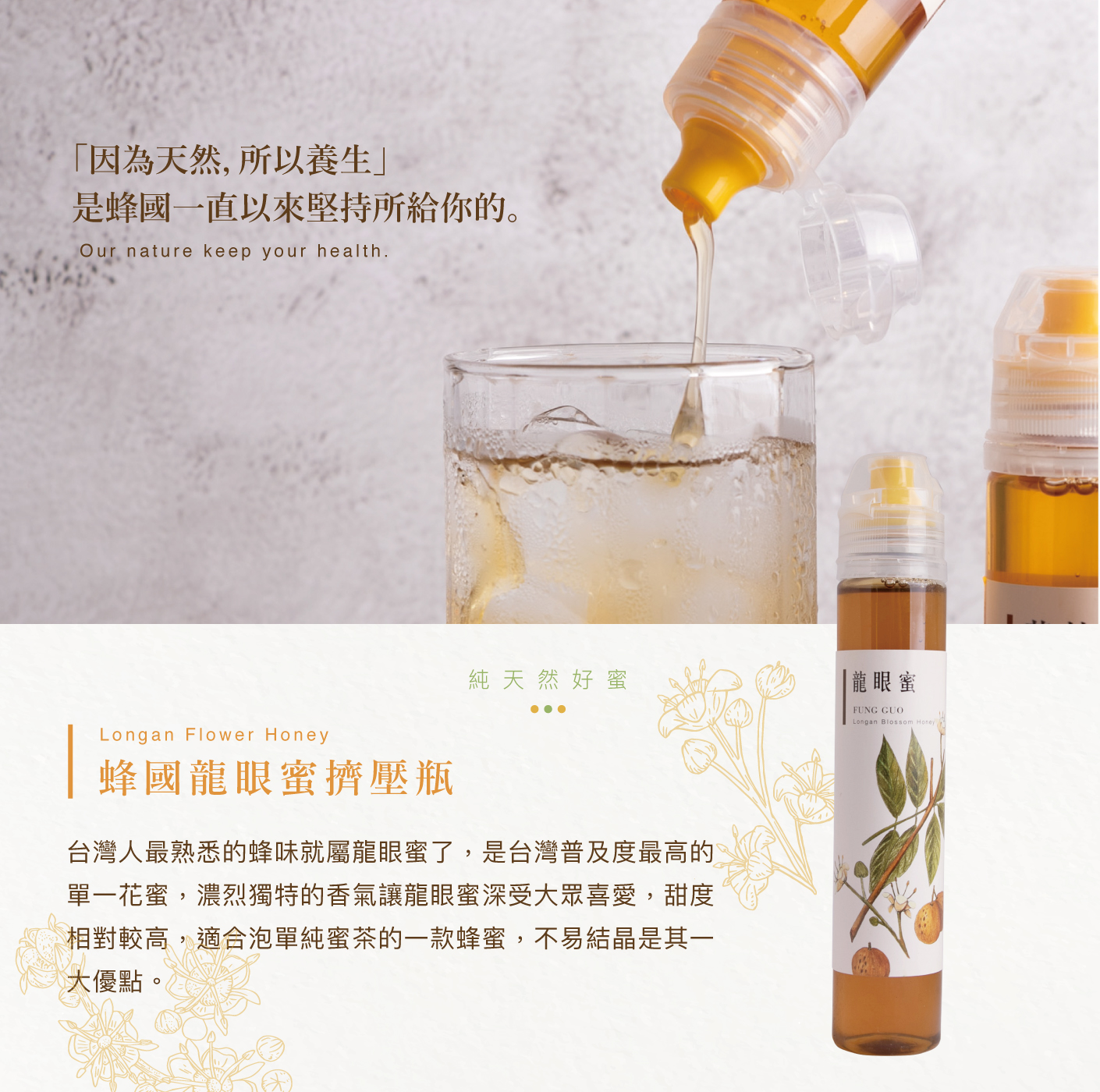 香氣濃郁,甜味⼗⾜,是台灣⼈最愛的單花蜜,有著濃烈的龍眼香氣,且⼝感及甜味濃郁,不易結晶是其⼀⼤優點。