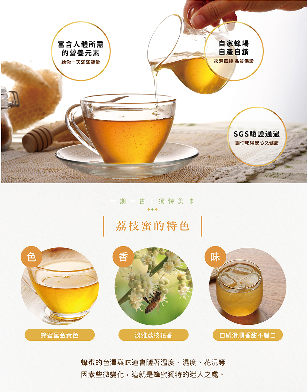 荔枝蜜是蜜蜂採集單一荔枝花蜜,蜜中帶有荔枝花香。