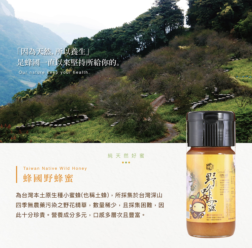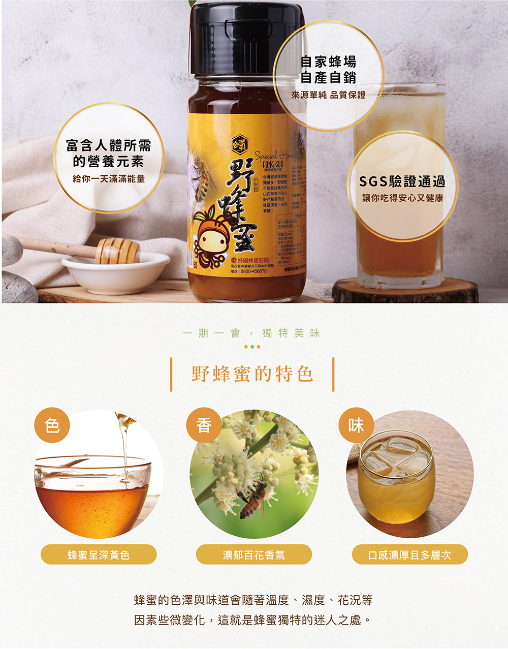 採集於台灣山區四季無農藥污染之野花精華,味道清香,自然香醇,特性易結晶,營養成分多元,⼝感多層次且豐富。