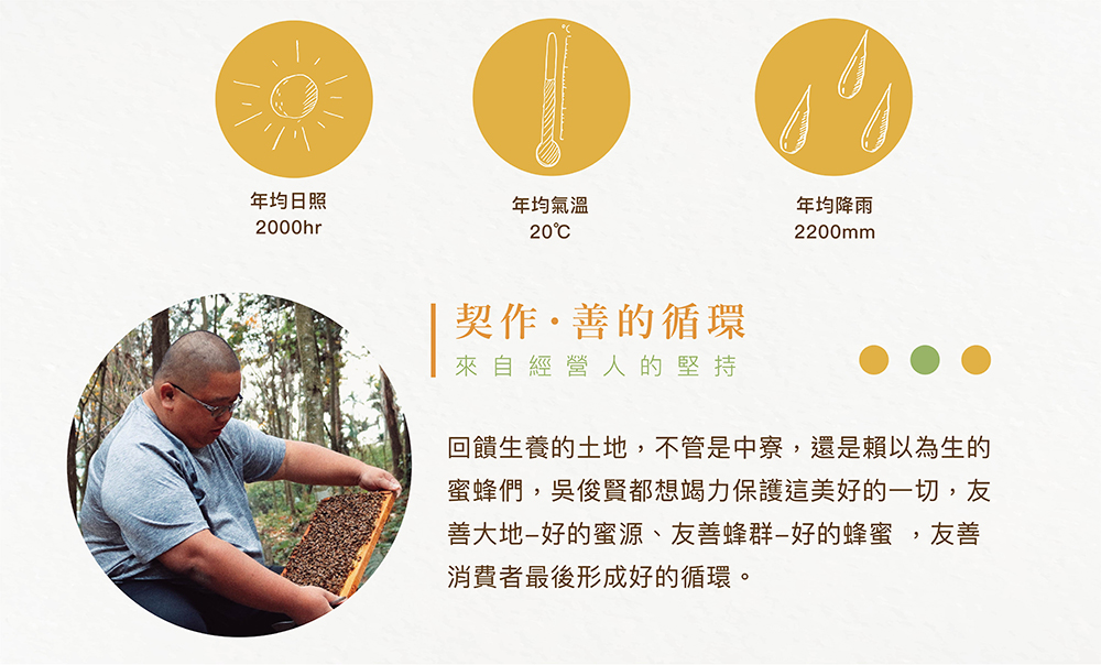 烏桕蜜為台灣較少見的花蜜,也是蜂國特色蜂蜜,花粉及花蜜量都很豐富,呈現晶瑩剔透的金黃琥珀色澤,蜂蜜本身帶有獨特草本、木頭碳焙香氣,清香微甜且尾韻帶有⼀點酸感和微微細緻的花香,適合不喜歡甜膩口感的人。