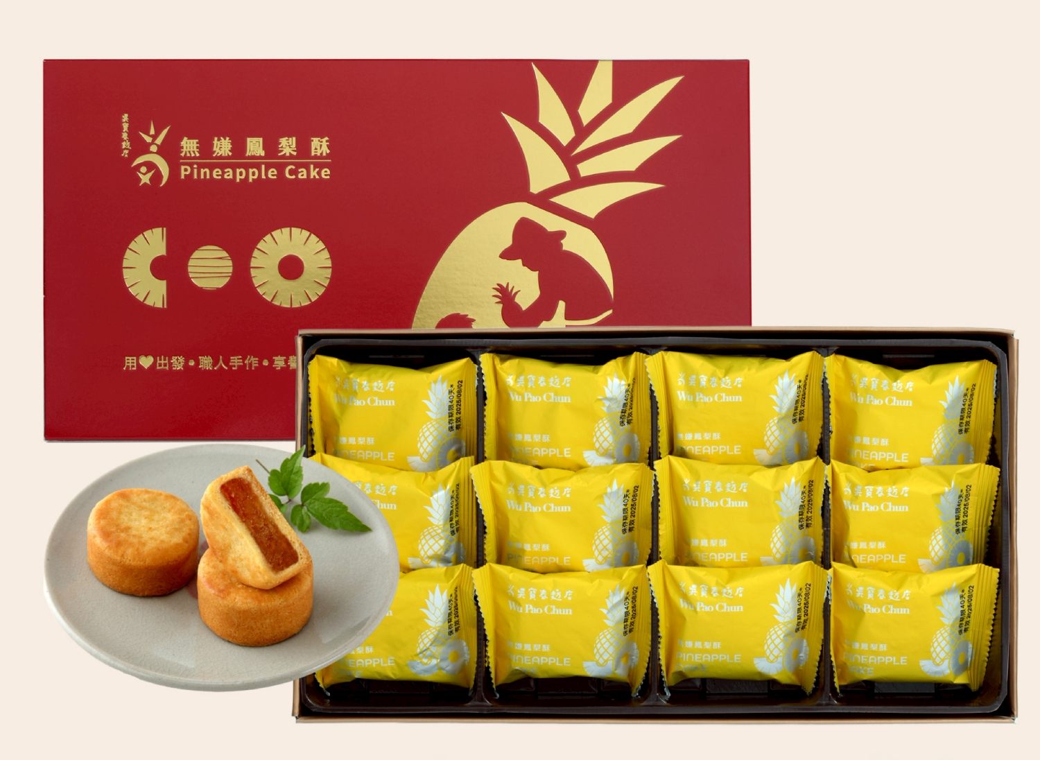 鳳梨冬瓜餡(鳳梨、冬瓜、麥芽糖、砂糖、奶油)、麵粉(小麥、小麥澱粉)、奶油、雞蛋、蔗糖、鹹鴨蛋黃(鴨蛋、食鹽)、奶粉、奶水(全脂奶、磷酸氫二鈉、磷酸二氫鈉)、高粱酒(高粱、小麥) |