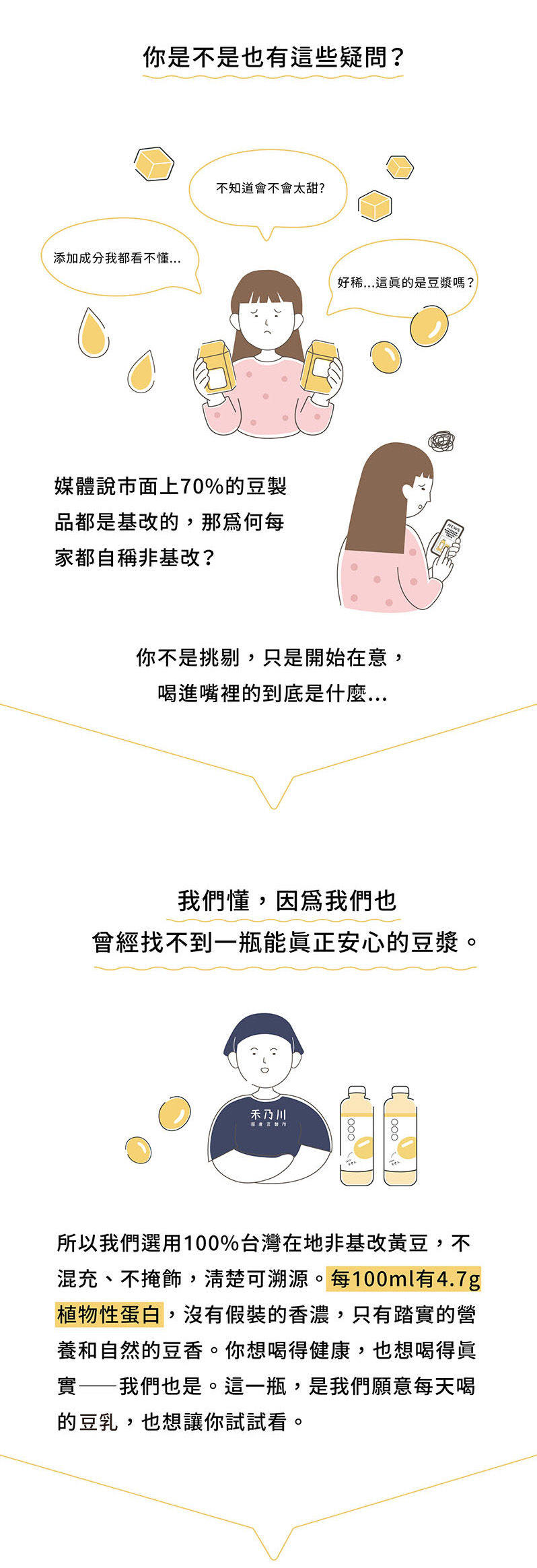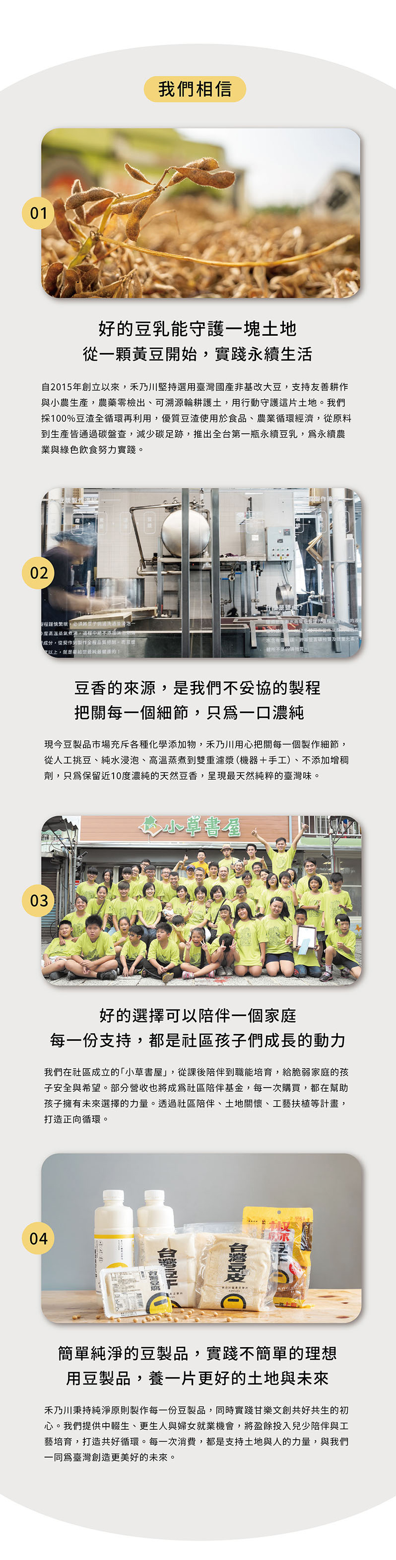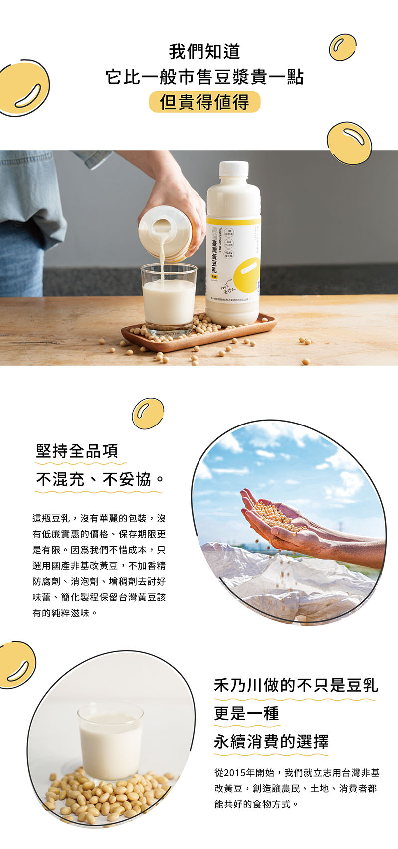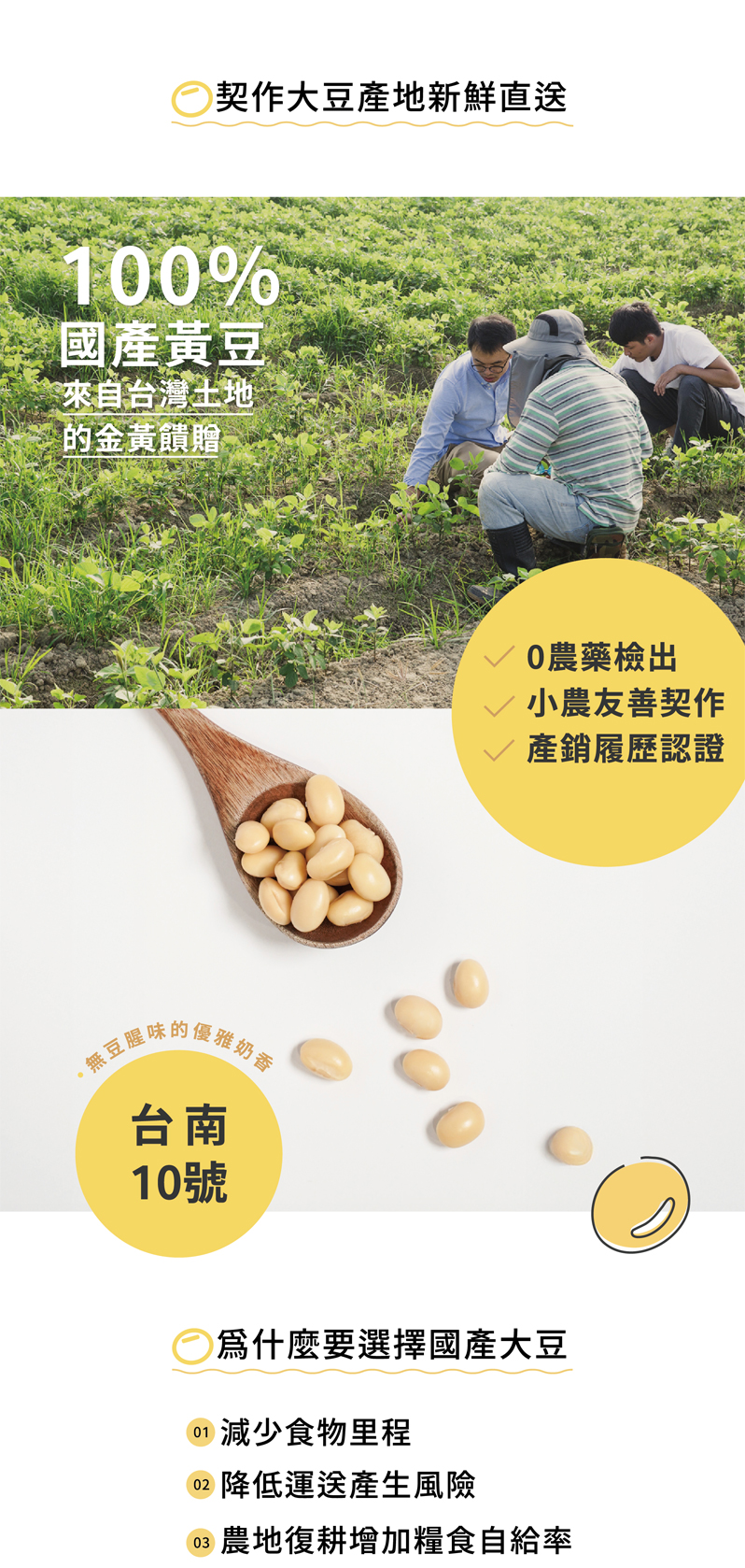 選用臺灣在地小農栽種,且透明可溯源的非基改黃豆。
