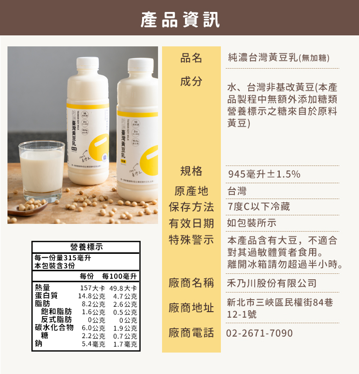 純濃黃豆乳原料:純水、臺灣非基改黃豆