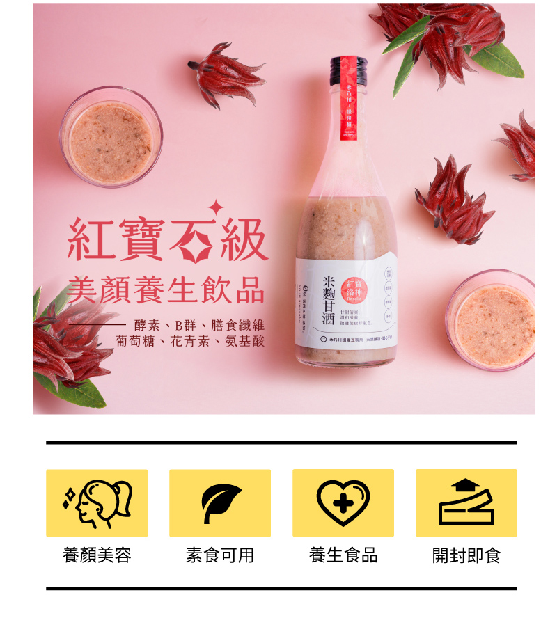 洛神米潤飲原料:純水、圓糯米、米麴(白米、麴菌)、乾燥洛神花