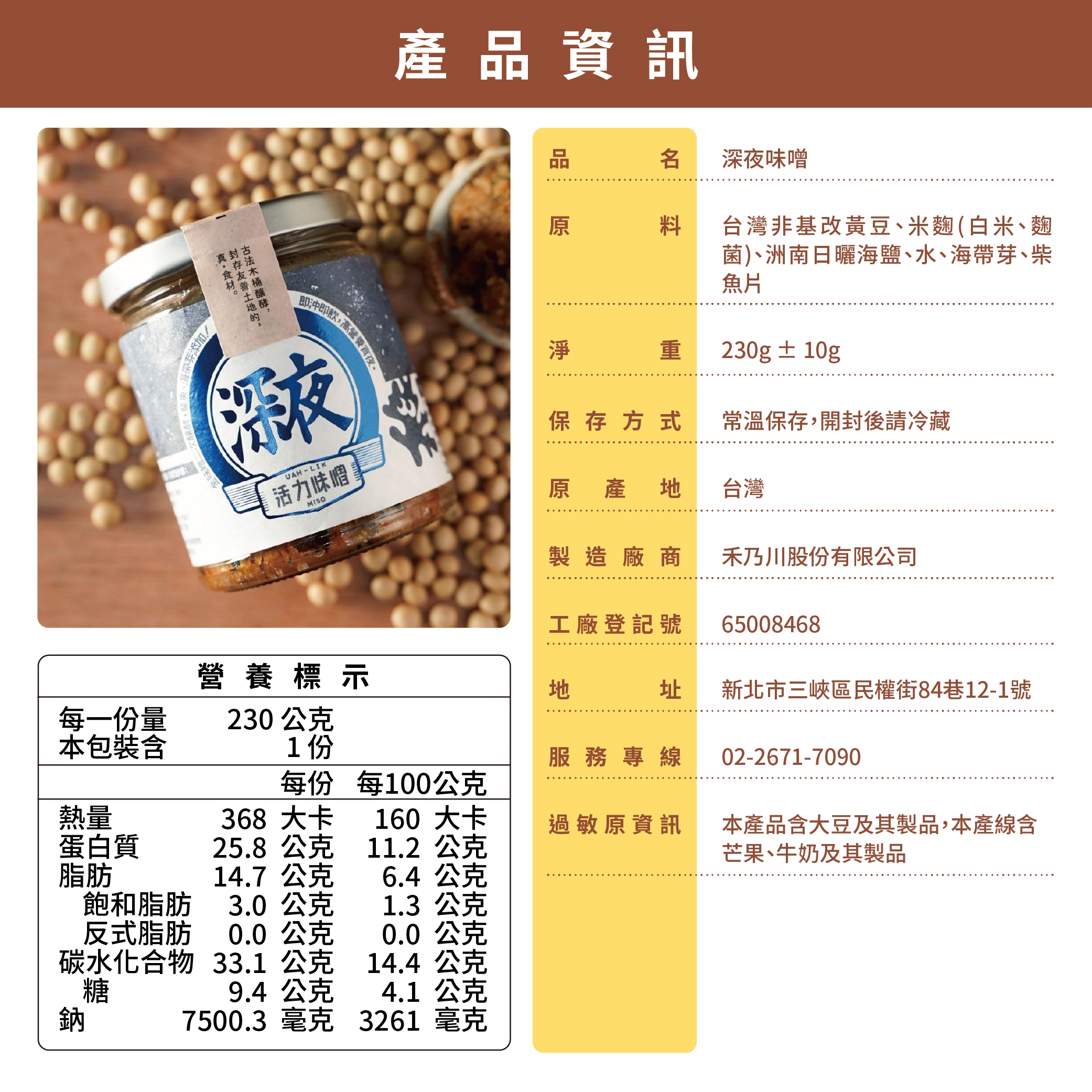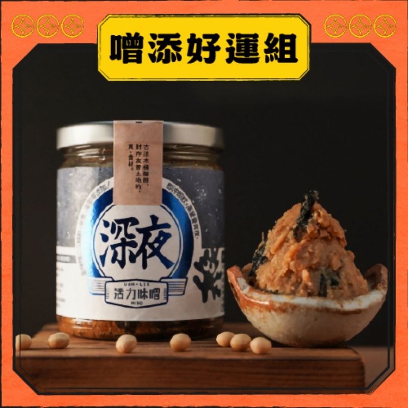 深夜味噌原料:國產非基改黃豆 、禾乃川米麴、洲南日曬海鹽、水、海帶芽、柴魚片
