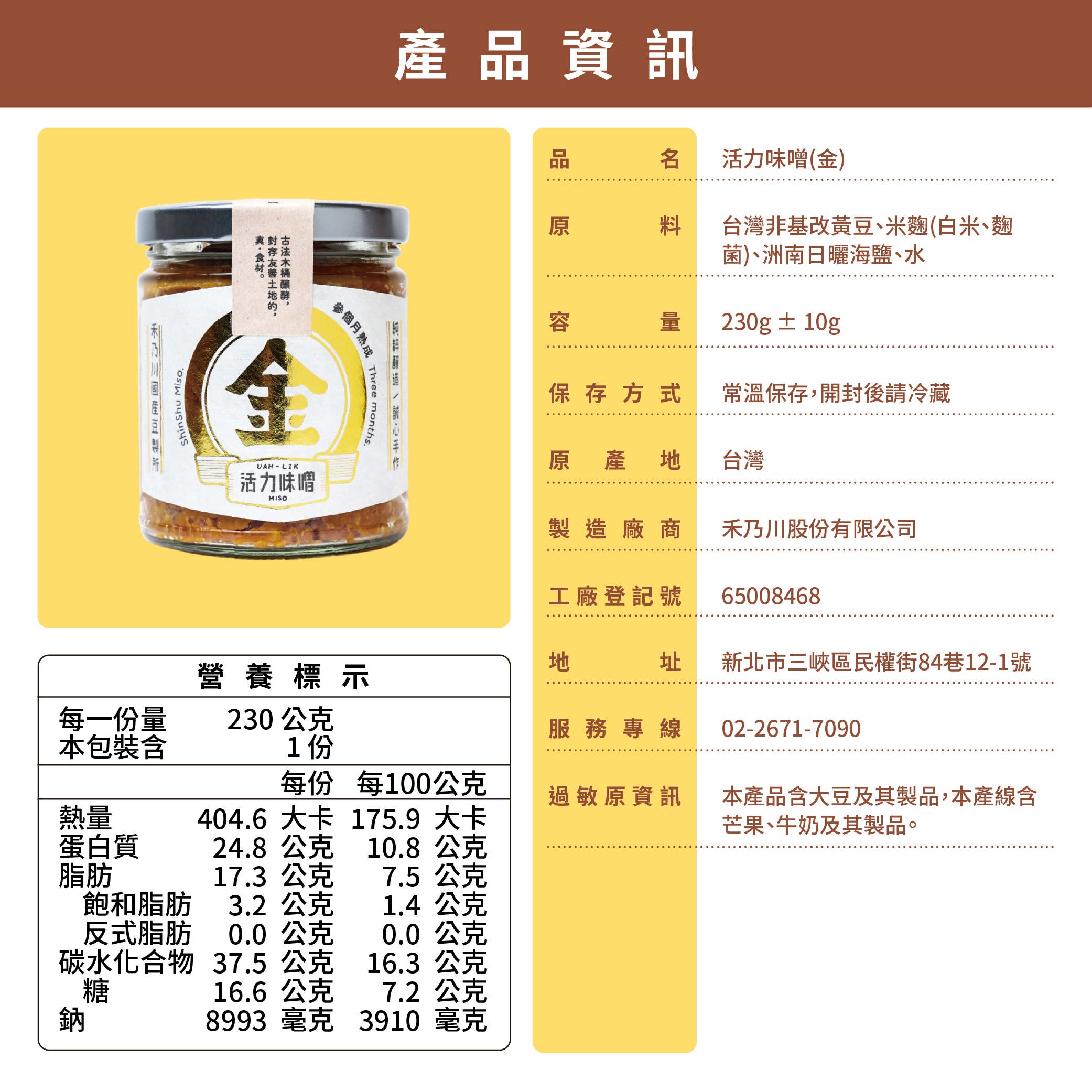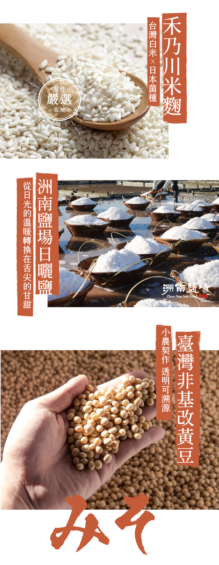 赤味噌原料:國產非基改黃豆、禾乃川米麴、洲南日曬海鹽、水