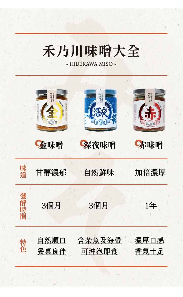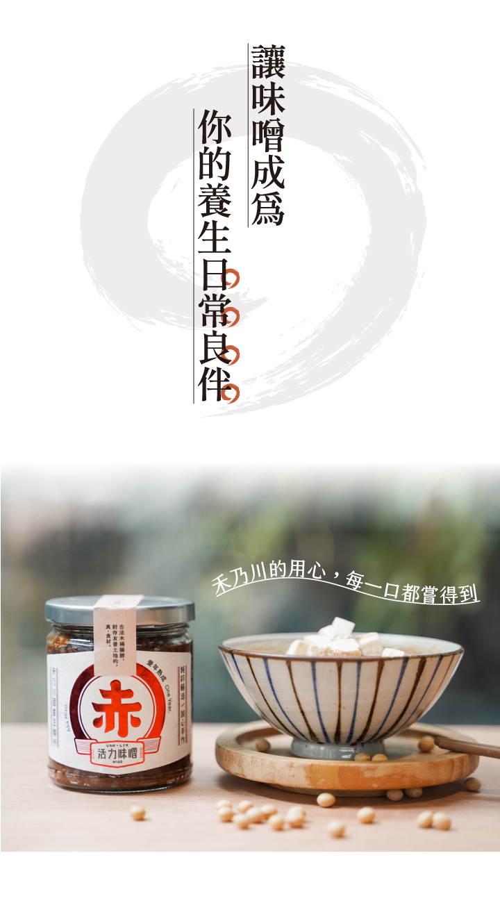 嚴選國產非基改大豆,純天然手工釀造製成,相較於進口大豆,國產大豆較無豆青味,豆香味更濃郁,經過日本百年味增老店優良菌種「糀」,經過1年釀造出的味噌濃厚甘醇,在豆香中帶著一股甘甜味,每一口都品嘗得到禾乃川手工釀造的用心。