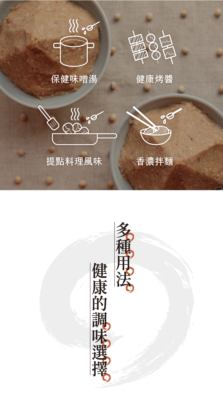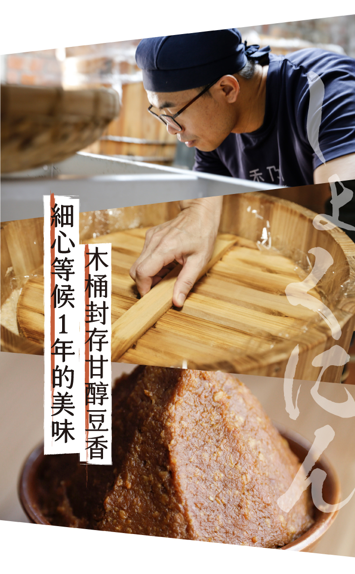 選用日本百年味增老店的優良菌種「糀」(kouji),和自然農法契作本土非基改大豆,封存在三峽老師傅的手工木桶中。僅用單純的食材讓時間熟成美味與營養。