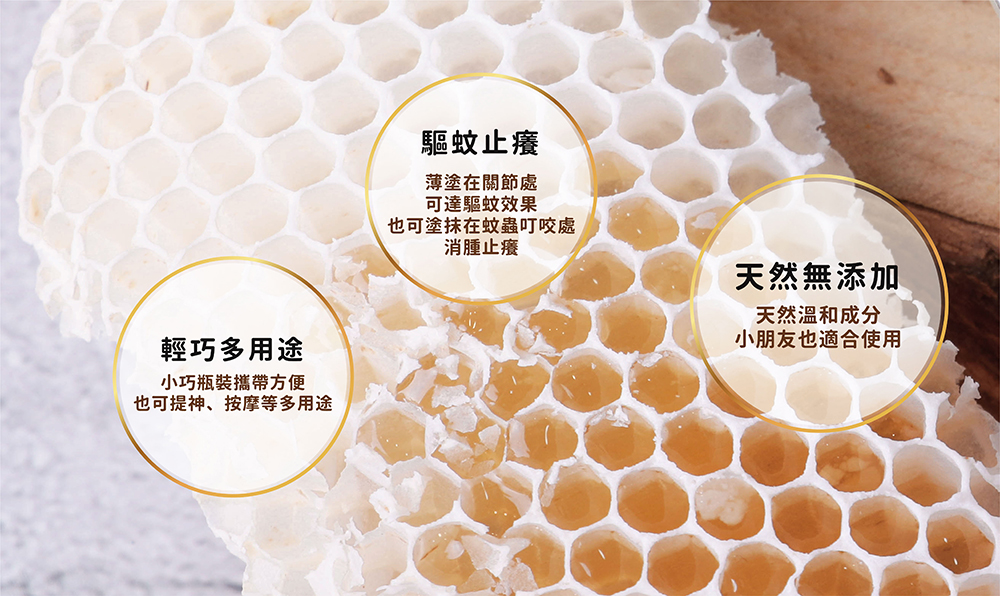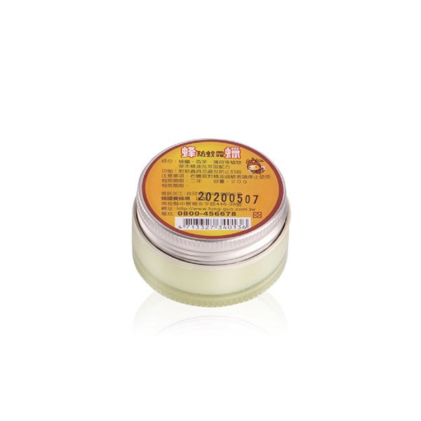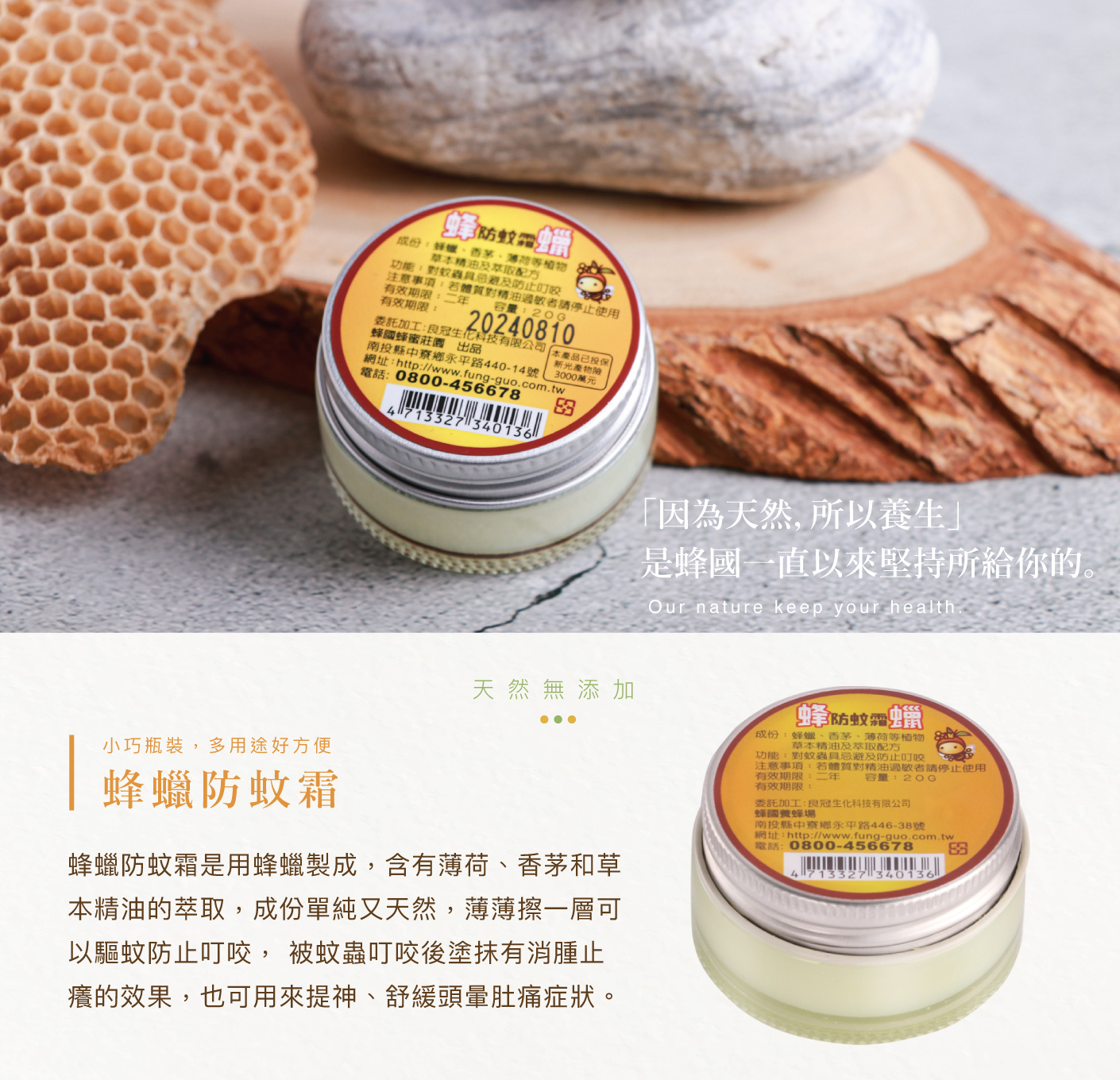 蜂蠟防蚊霜是用蜂蠟製成,裡面含有薄荷、香茅和草本精油的萃取,成份單純又天然,薄薄擦⼀層可以驅蚊防⽌叮咬, 被蚊蟲叮咬後塗抹有消腫⽌癢的效果,也可用來提神、舒緩頭暈肚痛症狀。