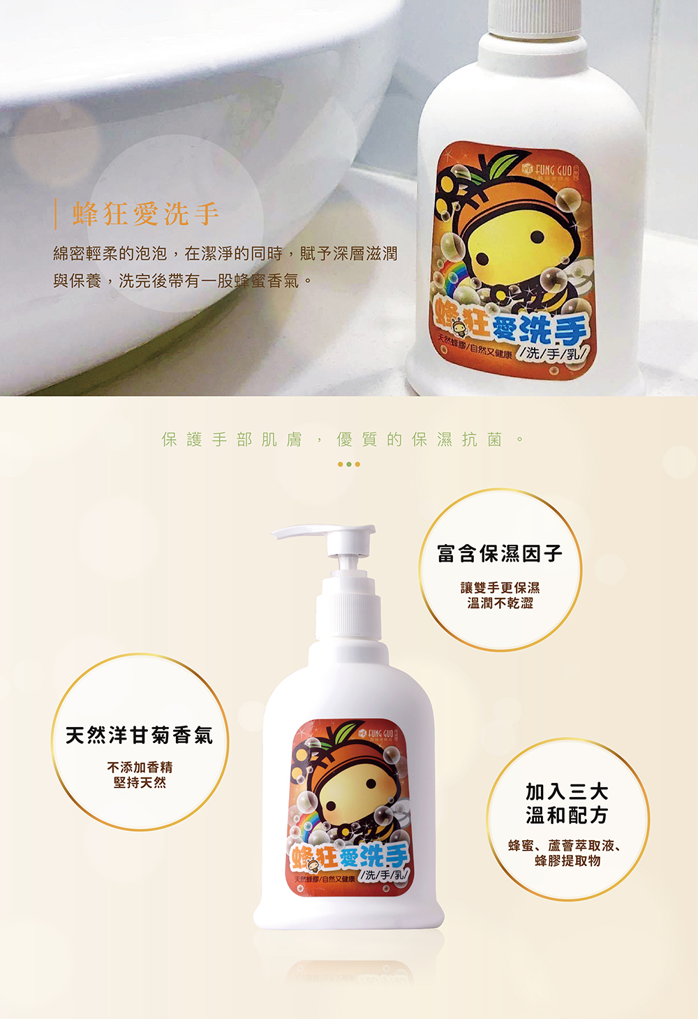 拒絕添加香精,擠出⼀滴就聞得到天然洋⽢菊香氣,我們的洗⼿乳除了富含高分子保濕因子外,還特別加了蜂蜜、蘆薈萃取液、蜂膠提取物三⼤溫和不刺激專利配⽅,使⽤起來溫潤不乾澀,保護手部肌膚,優質的保濕抗菌。
