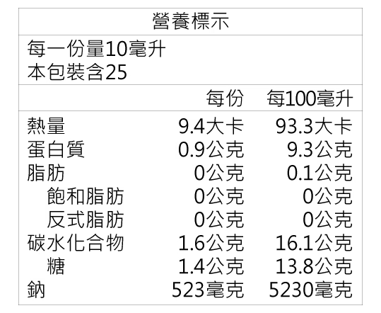 原 料:水、黃豆(非基因改造)、小麥、砂糖、食鹽、柴魚萃取液、酵母抽出物