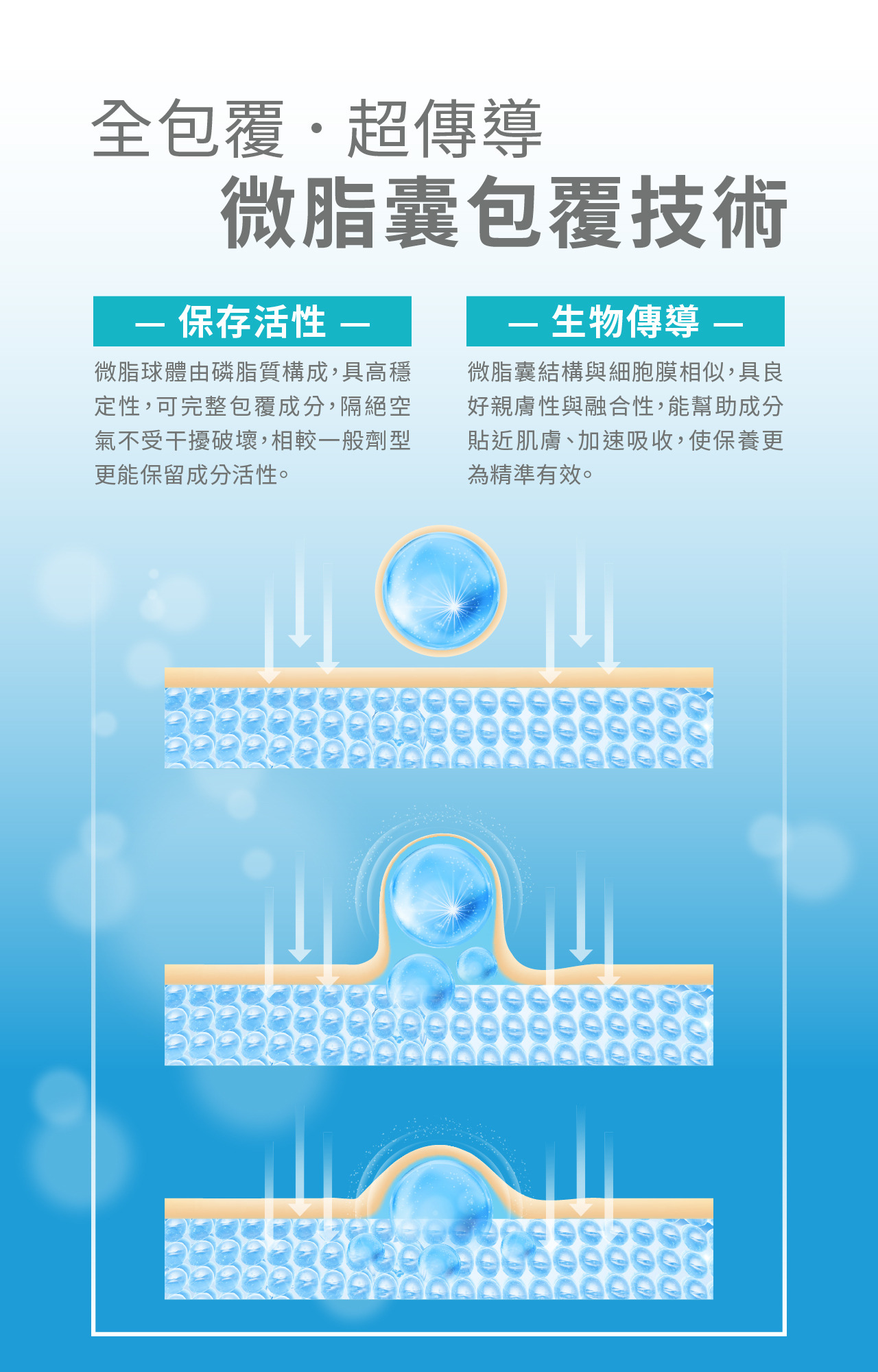 ◎ 微脂囊左旋C:以微脂球體包覆維他命C,封存活性好吸收