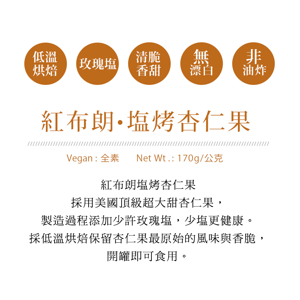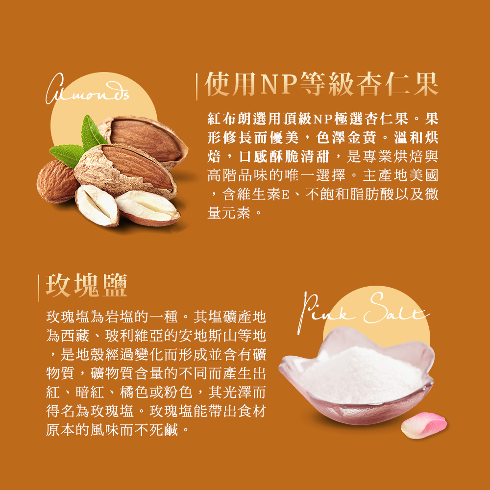 ★ 鹽烤杏仁果→添加少許玫瑰鹽,低溫烘烤,保留杏仁果原始風味與香脆。