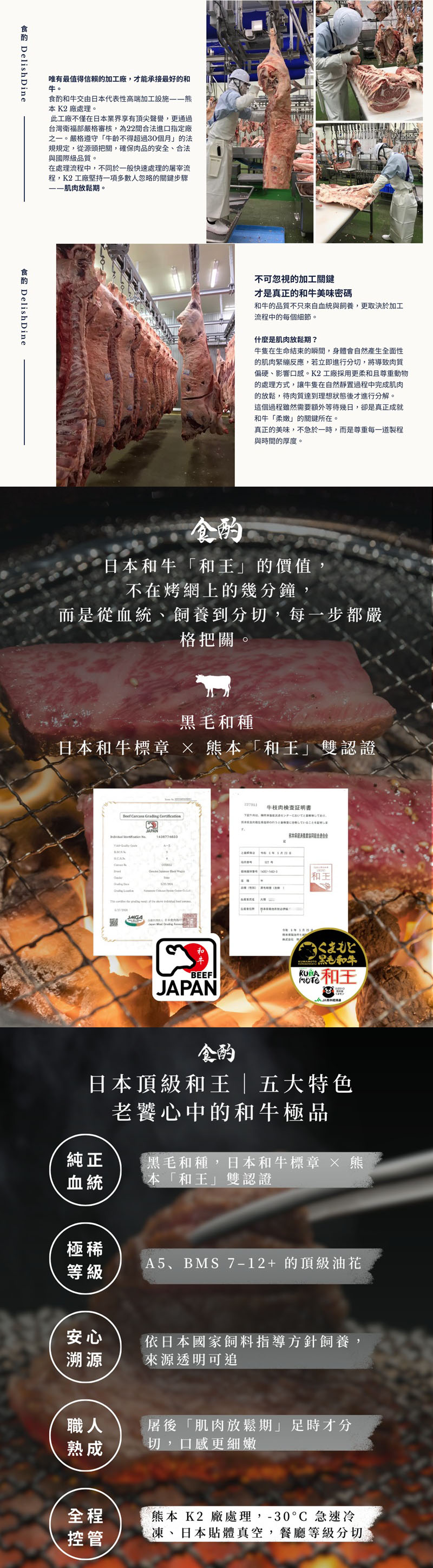 來自熊本縣的頂級品種「和王」,是為和牛之霸。熊本和牛肉質軟嫩且帶有溫和的味道,和牛油花遍佈均勻、鮮嫩且入口即化,是非常適合料理的極上牛種。「熊本牛」飼養數量為全日本第4,年產量約5萬頭,當地認證系統中的「和王」,是最高品質象徵。