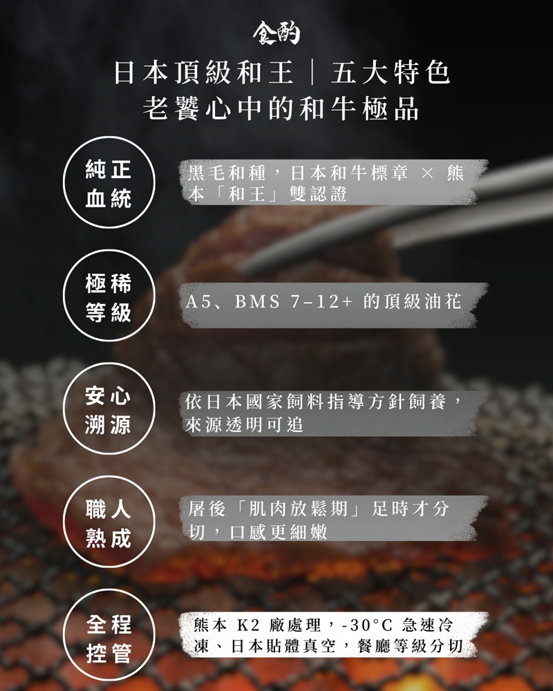 來自熊本縣的頂級品種「和王」,是為和牛之霸。熊本和牛肉質軟嫩且帶有溫和的味道,和牛油花遍佈均勻、鮮嫩且入口即化,是非常適合料理的極上牛種。「熊本牛」飼養數量為全日本第4,年產量約5萬頭,當地認證系統中的「和王」,是最高品質象徵。