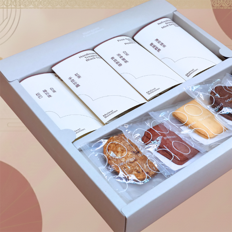 簡約沉靜的禮盒風格,禮盒上點綴了雅白色的茶葉、餅乾與寓意團圓的圖案,代表了送禮人的心意與祝福。你是否發現我們在茶葉、餅乾圖案上的小心思呢?美味的茶葉、餅乾好吃到都被咬了一口呢~