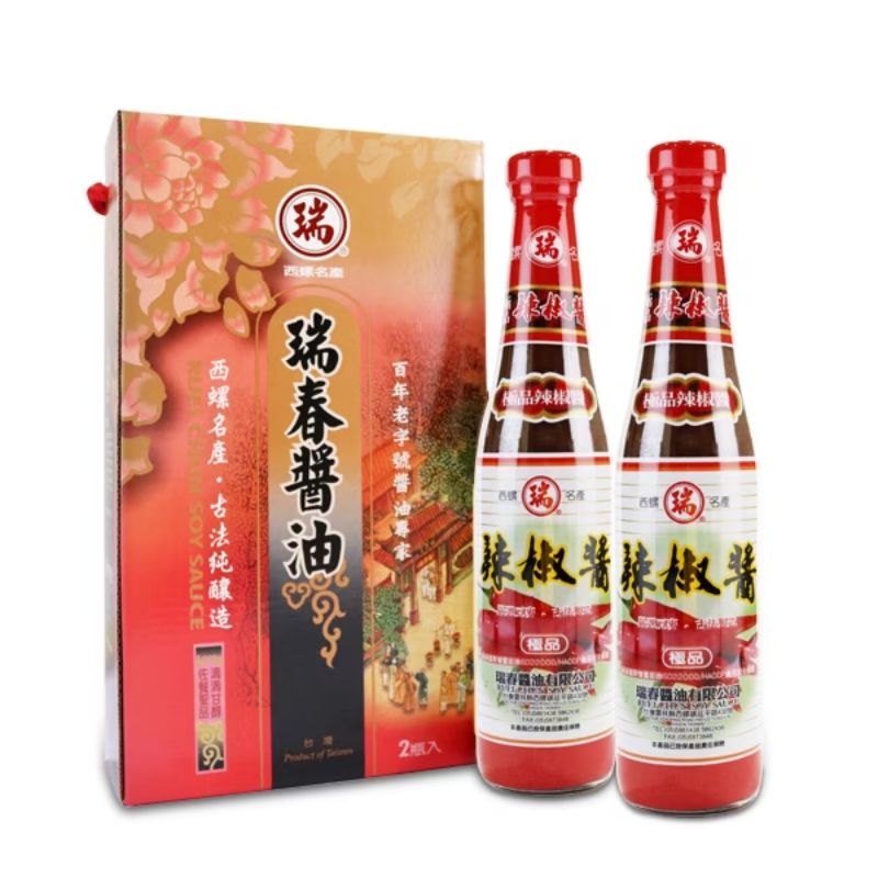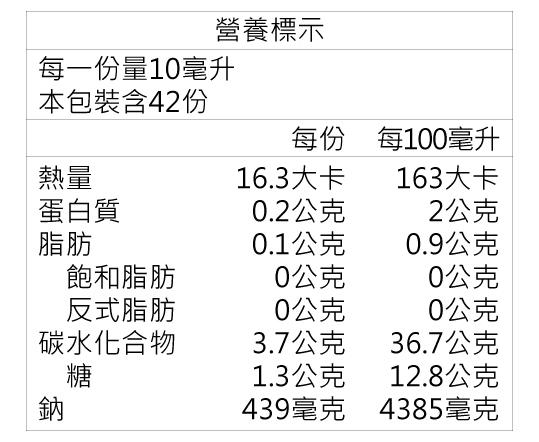 原 料:水、黃豆(非基因改造)、小麥、砂糖、食鹽、糯米、紅辣椒粉、雞心辣椒粉