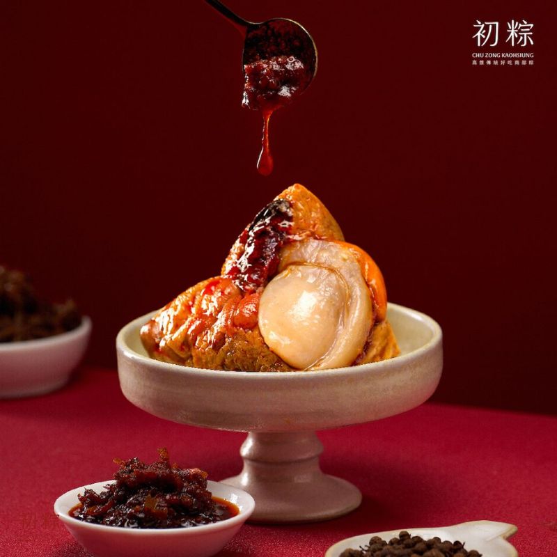 嚴選 整顆北海道生食級帆立貝,搭配初粽秘製麻辣醬,與香Q糯米與台灣食材一同包裹。