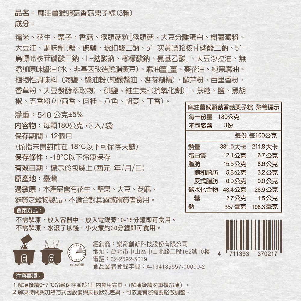 【陽明春天】麻油薑猴頭菇香菇栗子粽(3入)