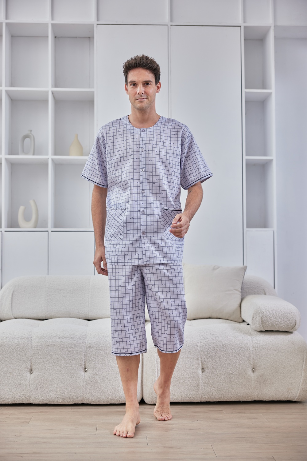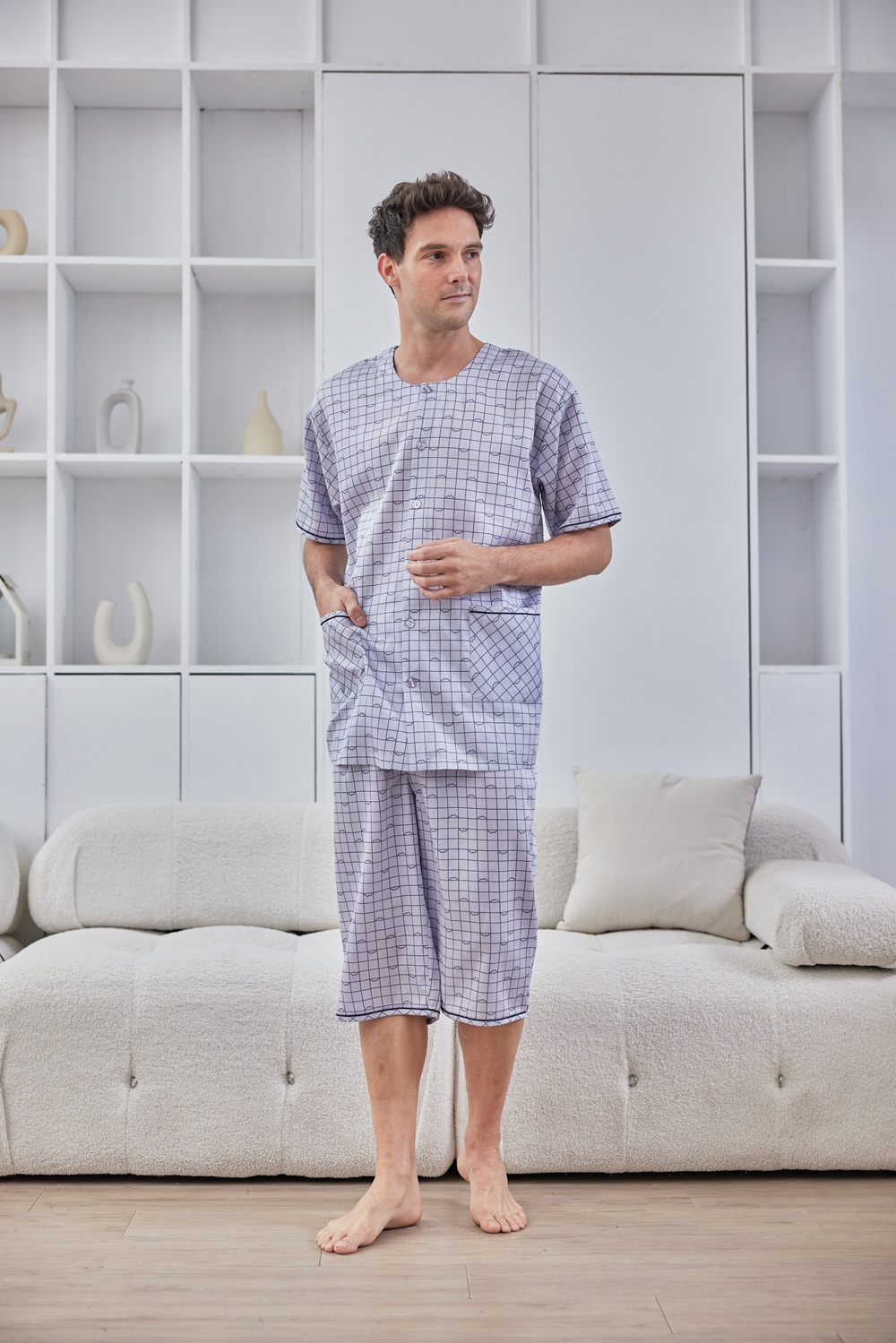 GOLDDEER金鹿 - 玩趣雲朵格薄棉夏季款圓領短袖七分褲睡衣-灰藍【M5101】