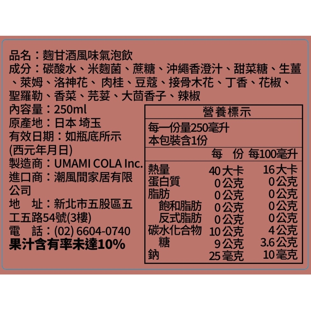 | 🇯🇵 日本人氣粉紅可樂|UMAMI COLA 麴甘酒風味氣泡飲(日本製) 來罐粉嫩系氣泡飲, 有別於你熟悉的可樂風味, 一喝就懂的 日系清爽系可樂。 🌾 米麴甘酒基底 以日本傳統自然發酵工藝製成, 風味溫和細緻,甜感柔和不厚重 🍋 沖繩香檬點綴 清新果酸讓氣泡更明亮, 入口清爽、尾韻乾淨 🌱 草本香料調配 肉桂、花椒等香料低調融合, 帶出層次感,不搶味、不刺激 💧 每瓶只有 40 kcal 輕盈無負擔,日常也能放心享用 🍃 0 咖啡因 × 0 酒精 × 無人工添加 不分時段,大人小孩都能安心喝 粉嫩外型 × 清爽風味, 是近年日本很受歡迎的 大人系粉紅可樂。 無論是午後會議、週末閱讀, 或朋友聚會的第一杯氣泡飲—— 隨手開一瓶 UMAMI COLA, 讓酸香、氣泡與發酵的風味層次, 成為生活的小確幸。 |