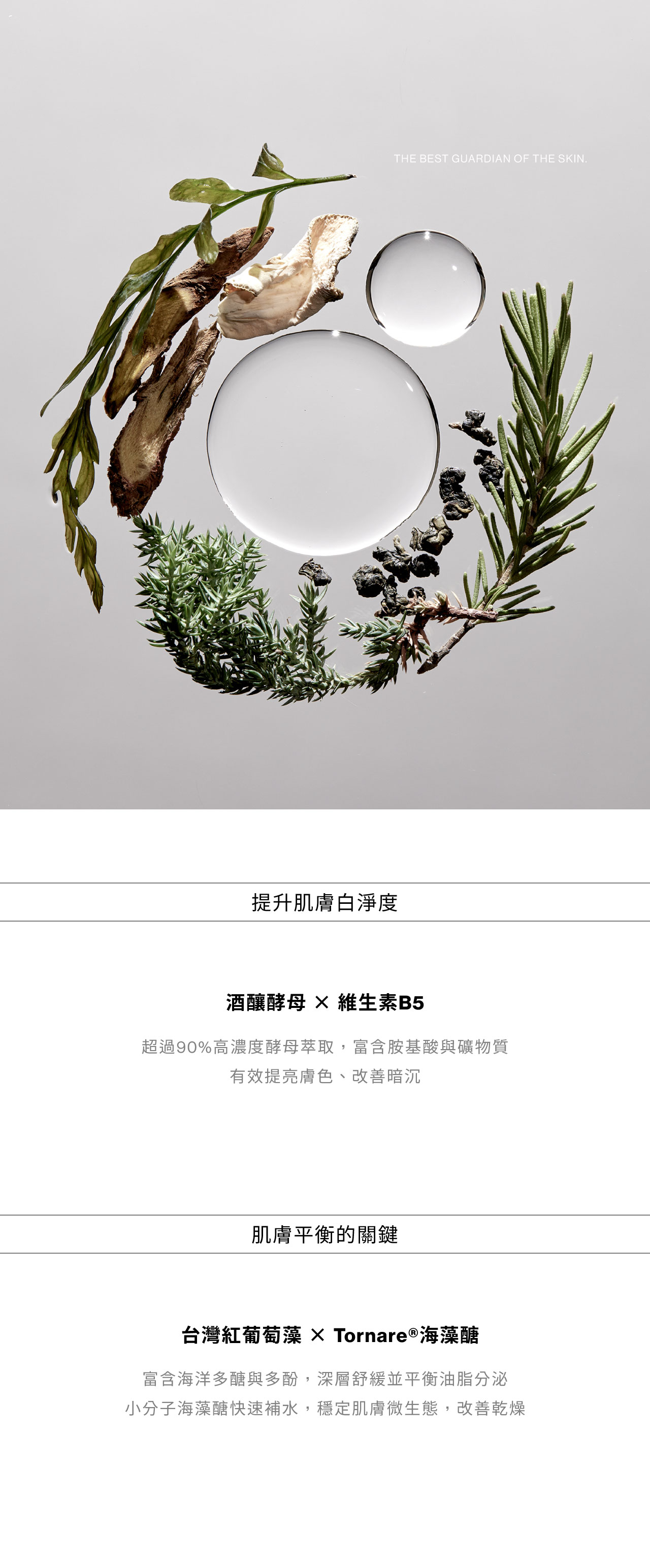 • 台灣紅葡萄藻與Tornare®海藻醣:來自台灣沿岸的紅葡萄藻被譽為「海洋紅寶石」,含有維他命、蕨藻多醣、多酚等多種海洋精華物質,能深層滋養、舒緩修護肌膚並平衡油脂分泌。Tornare®海藻醣則具備小分子水分調理能力,迅速提升肌膚含水量,改善乾燥、穩定肌膚微生態,恢復柔嫩膚觸。