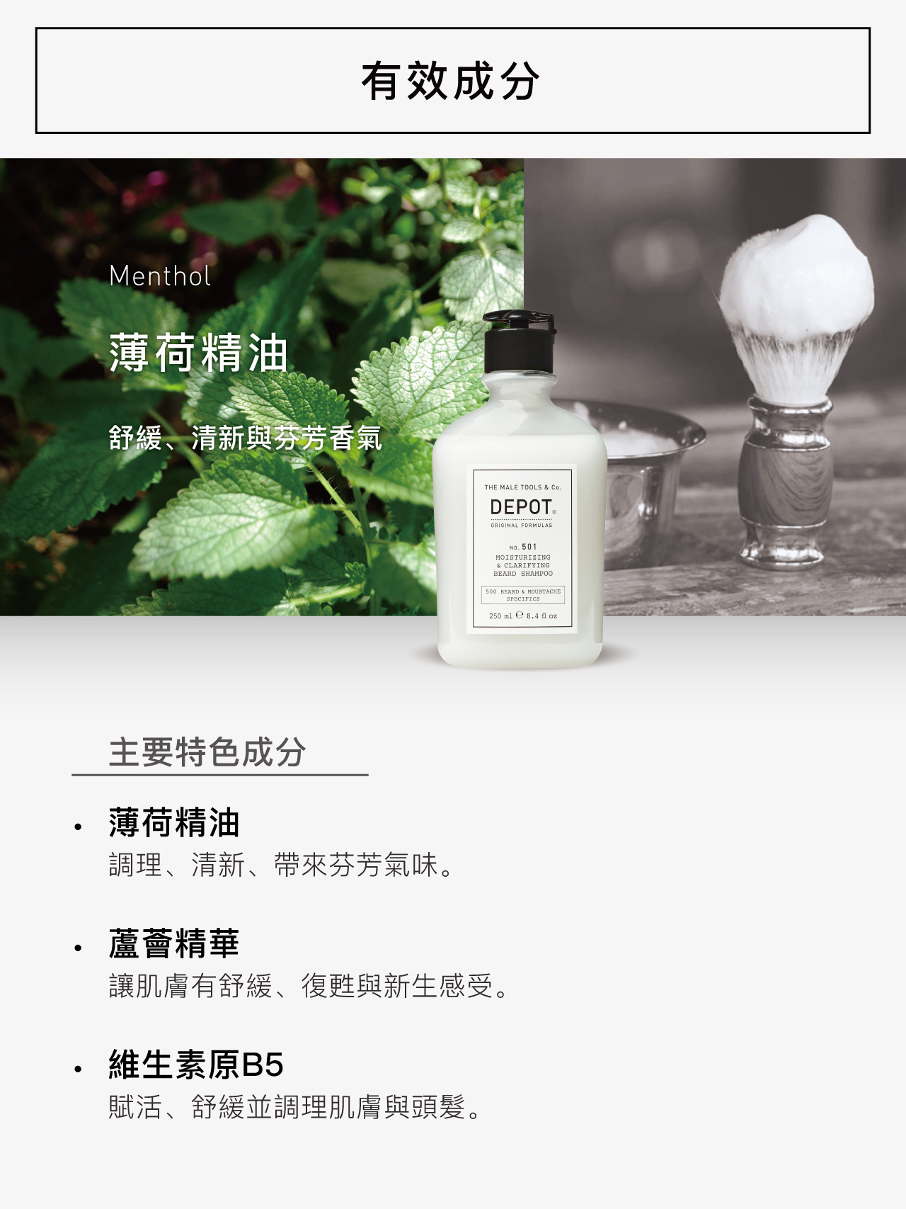 • 配方不含 SLES,對鬍鬚及肌膚深入清潔、調理與清新功效。