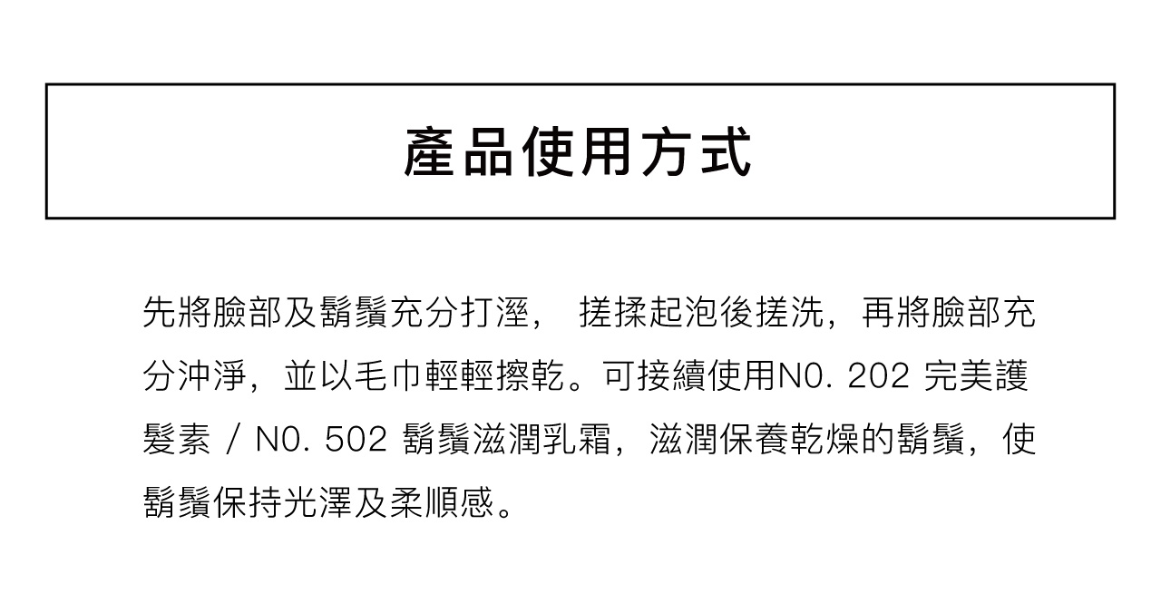 • 為增加柔軟度與操控度﹐可接著使用 [ 202 完美護髮素 ] 以及/或 [ 502 鬍鬚滋潤乳霜 ]。