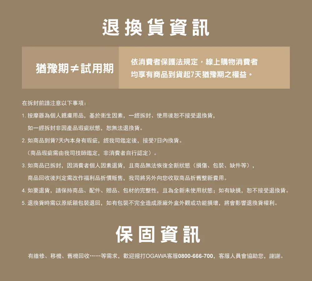 SOGOplus購物的消費者,除依法律規定不適用7天猶豫期之商品外,都可以依照消費者保護法規定,享有商品到貨享七天猶豫期之權益(請留意!猶豫期非試用期),依法辦理退貨商品必須是全新狀態且包裝完整(包含主機、附件、內外包裝、隨機文件、贈品等)。如商品一經拆封或使用致商品價值受損,SOGOplus將向消費者就商品一部或全部價值減損收取適當之費用(回復原狀、整新費、消毒費等) (若無法復原,僅能以福利品出售,費用將以商品價值損失計算)。如銷售時已特別註明無法退換貨之商品,請先確認商品正確、外觀可接受再行使用,以免影響您的權利,祝您購物順心。