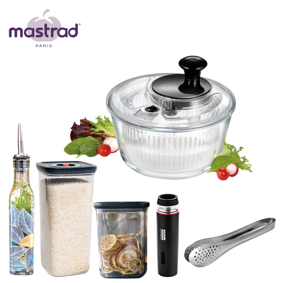 法國瑪仕翠玻璃蔬菜脫水器+不鏽鋼夾+方形環保密封罐(中1.4L+大2L)+歐風玻璃油醋瓶250ml+電動抽真空機 #F31281+UC-28304+ST111+ST112+UC-OIL+ST116