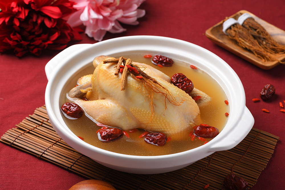 以全隻嫩雞加上紅棗、薑片、枸杞和人蔘鬚長時間燉煮製成,是冬日進補的藥膳。
