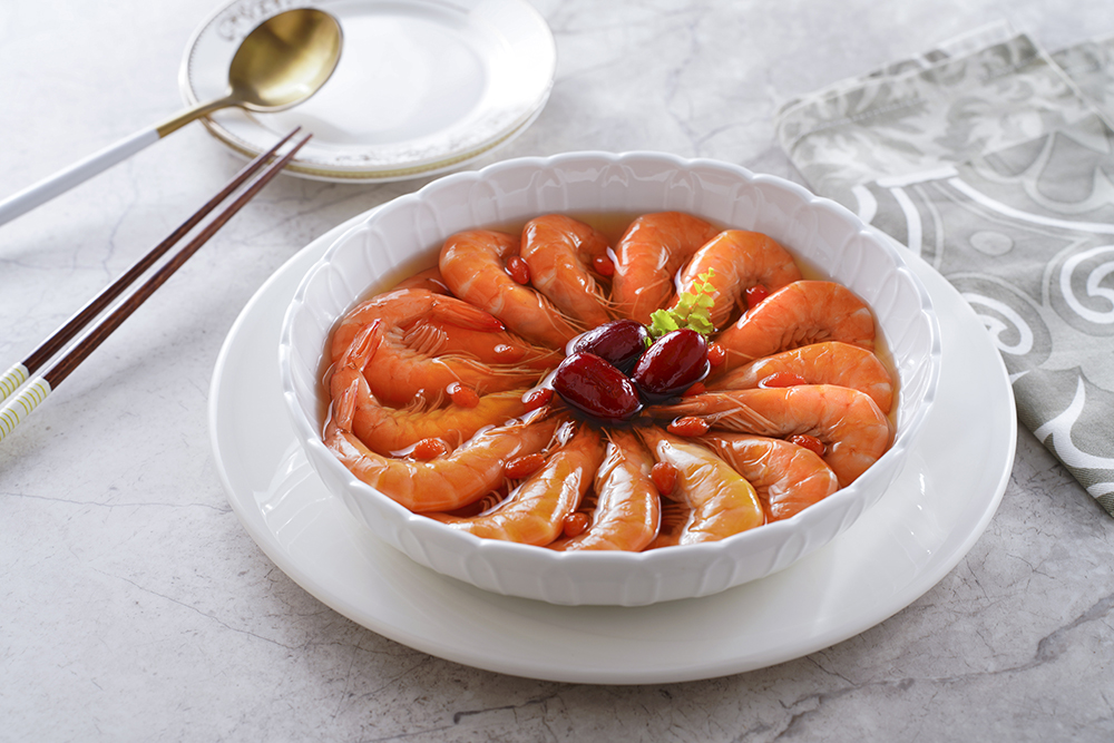 堅持使用屏東產地直送的現流白蝦,以頂級當歸、人蔘鬚、黃耆等獨門藥膳配方,及紹興酒調製的湯汁浸泡,蝦肉緊實Q彈飽滿,清爽鮮甜甘醇入味,繚繞於口中的微微藥膳及酒香味,讓人口齒留香回味無窮。