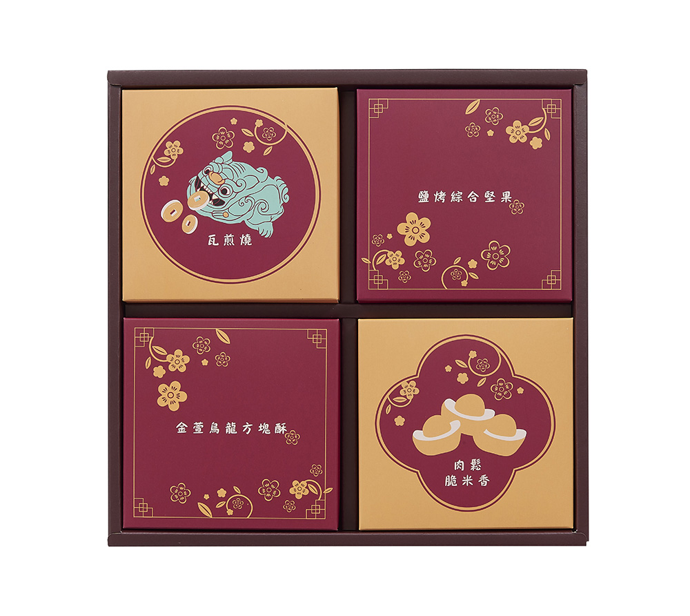 中層:瓦煎燒, 鹽烤綜合堅果, 金萱烏龍方塊酥, 肉鬆脆米香