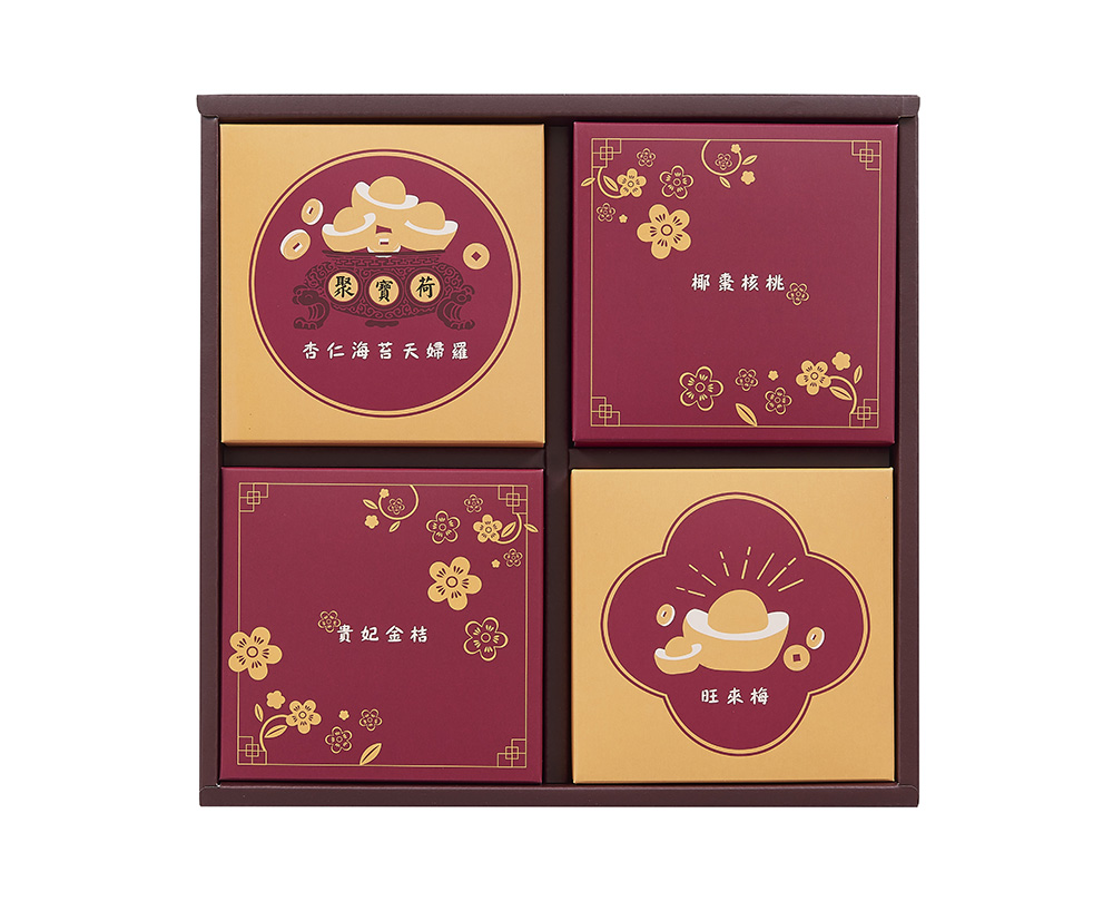 上層:杏仁海苔天婦羅, 椰棗核桃, 貴妃金桔,旺來梅