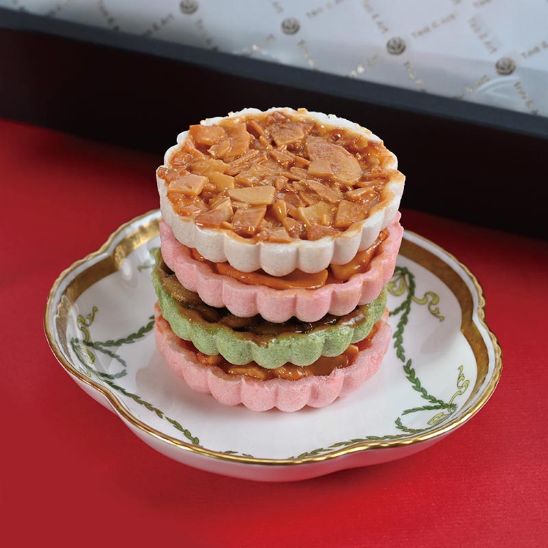 餅體以「花邊糯米殼」為基底,搭配香脆堅果、澄黃潤澤的焦糖漿,彷彿花漾漫舞。